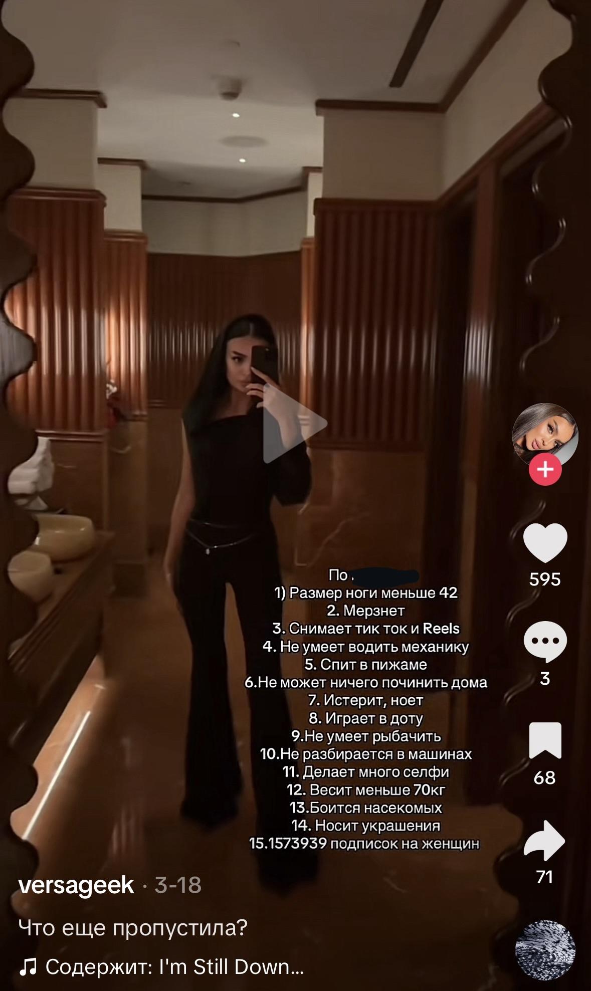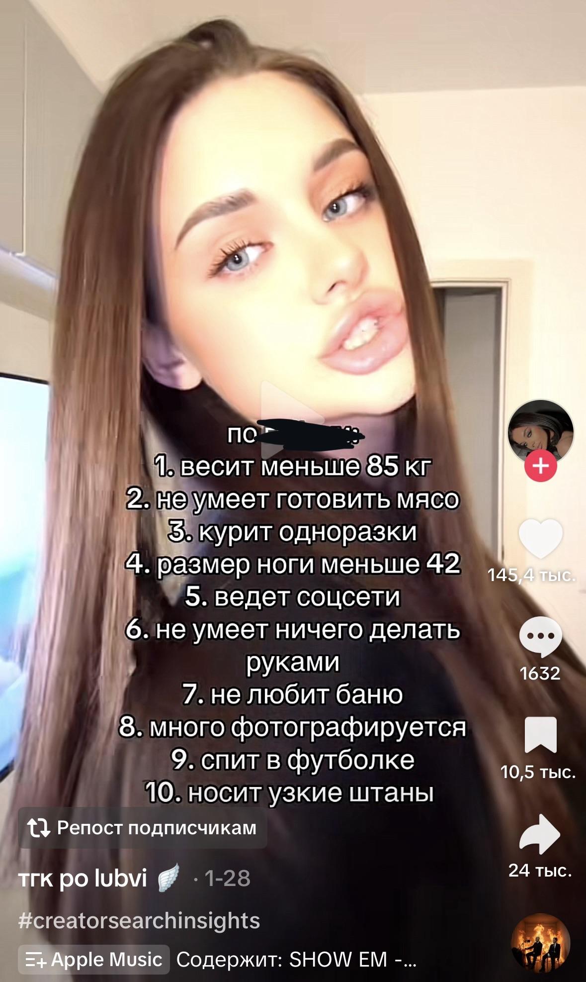 Девушки отмечают: чем менее активно мужчина ведет соцсети, тем он привлекательнее. «Если у него есть время сидеть и собирать актуальное в „Инстаграме“ (запрещенная в России экстремистская организация) со своими фото, значит, он недостаточно активно строит карьеру», — считают пользовательницы TikTok. Желательно, чтобы у него не было аватарки, в профиле висела одна фотография пятилетней давности и чтобы он не знал, как выкладывать reels.
