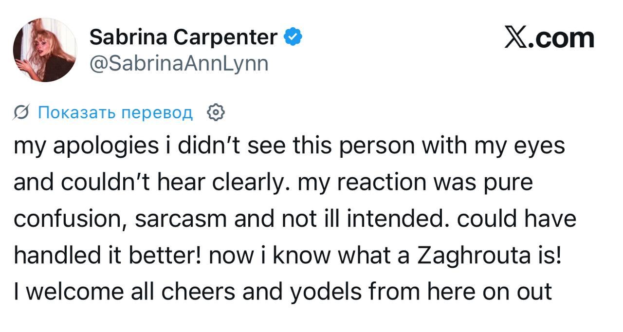 В этом «звуке» пользователи узнали загруту — женское улюлюканье, распространенное в арабской культуре, которое означает призыв к радости и часто используется на праздниках. Позднее Сабрина публично извинилась на своей странице в соцсети Х: