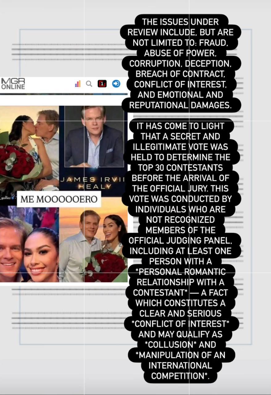 Помимо того, бизнесмен сообщил, что у одной из уже выбранных претенденток, которая пройдет в финал, роман с членом жюри: «Там есть конфликт интересов. Речь идет о двух вещах. Первое — его невеста, второе — он председатель комитета „Мисс Вселенная“».