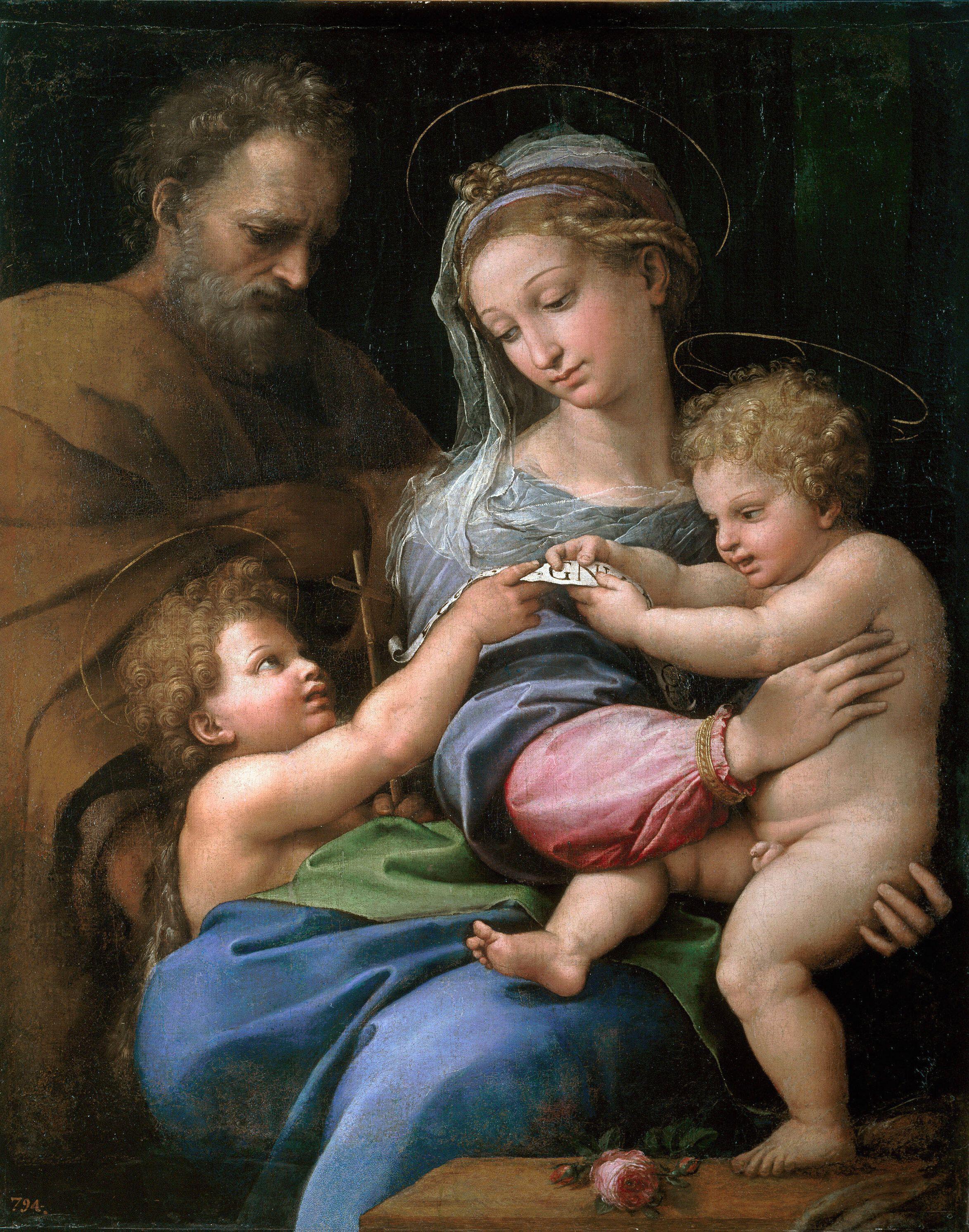 Мадонна, Младенец и святой Иоанн изображены так, словно созданы рукой самого Рафаэля, но изображение лица у святого Иосифа вызывает вопросы и сомнения. Ученые отмечают, что в предыдущих дискуссиях о подлинности произведения лицо святого Иосифа выглядело менее мастерски исполненным по сравнению с другими персонажами, изображенными на картине.