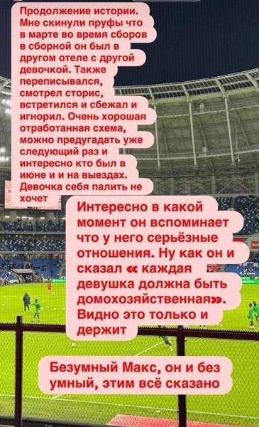 Позже, когда ситуация вскрылась, на девушку посыпался не только хейт, мол, как можно раскрывать тайны личной жизни, но и доказательства еще одной неверности футболиста. С Артамоновой связалась девушка, утверждающая, что переспала с Максимом, когда в марте он был вызван в сборную.