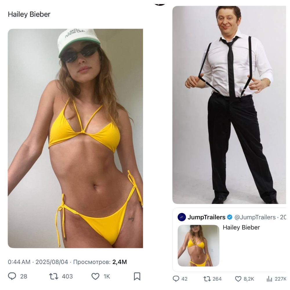 Одним из самых популярных постов в «Х» на тему обожания Брекоткина стала публикация аккаунта «JumpTrailers» с фотографией Хейли Бибер в купальнике. Людям показалась забавной публикация без лишних слов, и в комментариях начали отправлять разные фотографии с подписями. Но больше всех поразило то, что комментарий одного из пользователей, который прикрепил фото Дмитрия Брекоткина, набрал больше лайков чем фото Бибер.