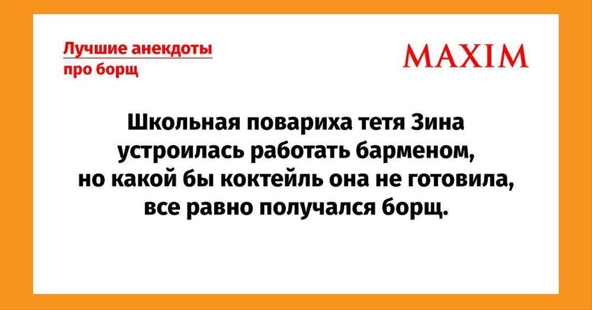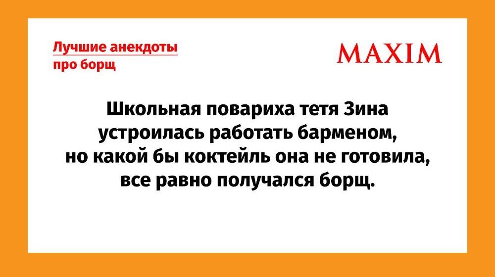 Сегодняшний день недопустимо провести на кислых щах, ибо сегодня, 10 ноября, — Всемирный день борща. Праздник молодой, как июньская капустка, но уже горячо любимый в той части народа, что о нем знает. MAXIM приготовил для вас богатый стол — огромную подборку лучших и самых смешных анекдотов про борщ. На здоровье!