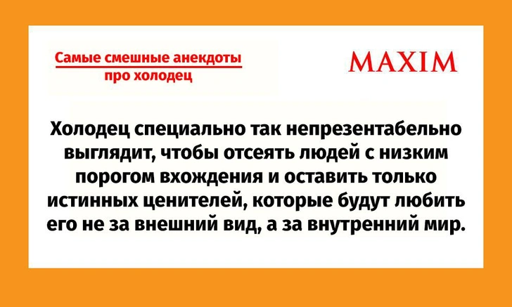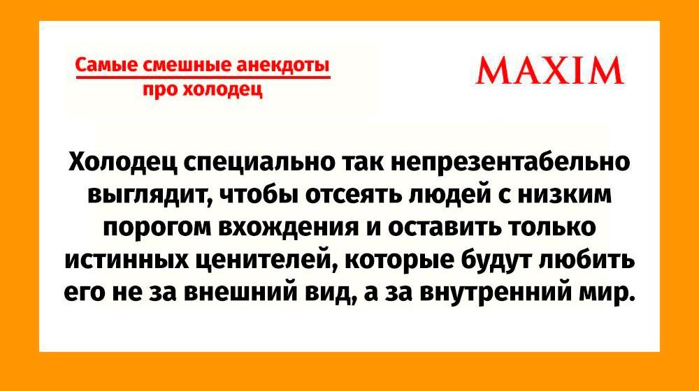 Сегодня свой профессиональный праздник отмечает блюдо, которое совершило поистине революцию в гастрономии и завоевал самую горячую любовь в русском народе! 7 ноября — День холодца. MAXIM наготовил для вас громадную и сочную подборку лучших и самых смешных анекдотов про холодец. Да, есть и такие!
