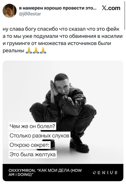Начнем издалека: в марте 2025 года две девушки обвинили Оксимирона в груминге, растлении малолетних и изнасиловании. Фанаты и хейтеры ждали ответа от рэпера, но его всё не было. Даже появились слухи, что он якобы борется с раком или еще какой-то смертельной заразой.