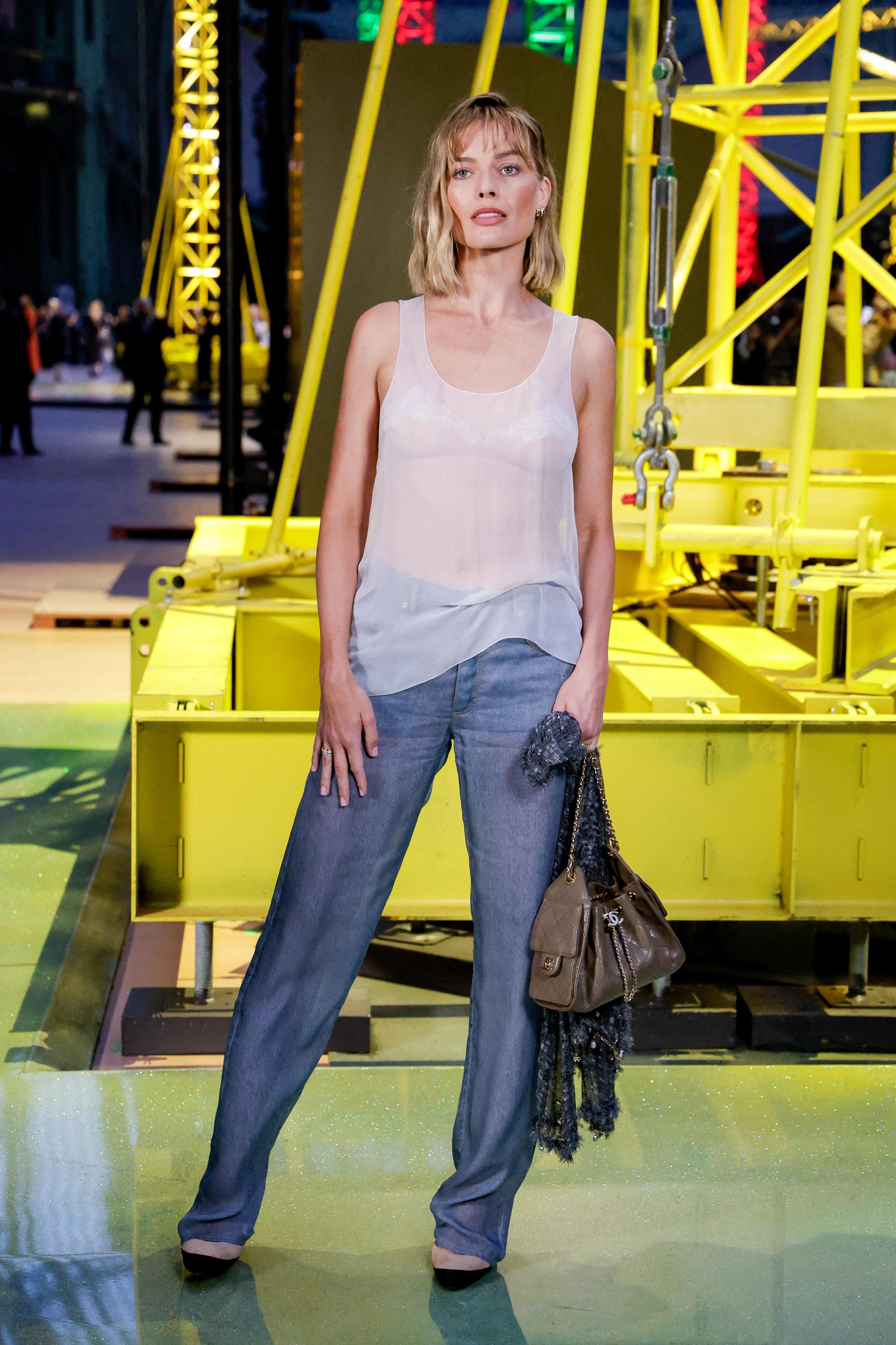 Марго Робби продолжает череду образов в поддержку своего нового откровенного фильма «Грозовой перевал». На показе Chanel актриса появилась в прозрачной майке, из-под которой выглядывает кружевной бюстгальтер.