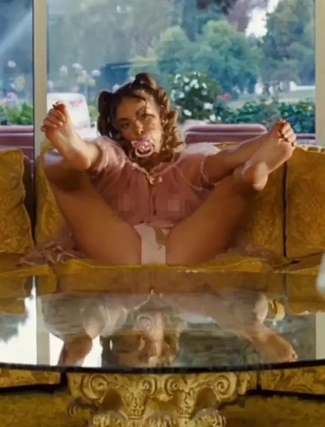 Возмущение у зрителей вызвали кадры, где Суини позирует в образе маленькой девочки с соской во рту, а также переодевается в собаку для создания сексуализированных фотосессий.
