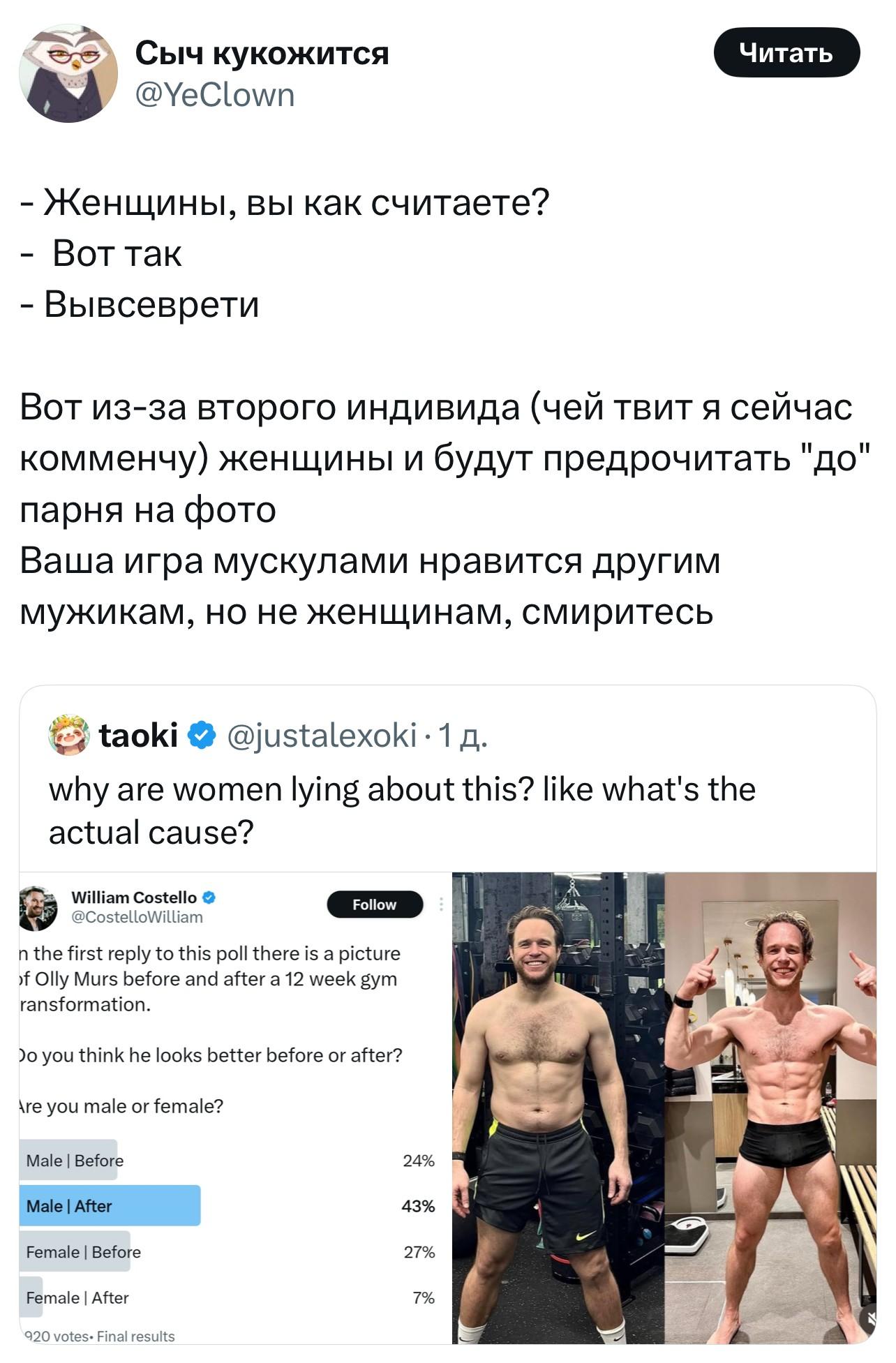 В «Твиттере» на сей раз произошел срыв покровов, явивший миру внезапную истину. Пользователь с ником taoki @justalexoki выложил твит, в котором собрал скриншот голосования, где другой пользователь провел опрос, кому какие фотографии парня нравятся больше: до 12-недельной сушки, когда у него есть лишний вес, или после нее.