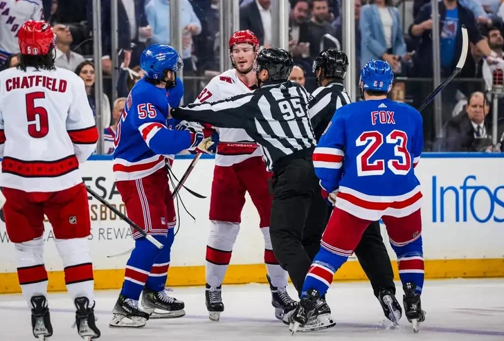 Пример — плей-офф НХЛ-2023/24, матч между «Каролиной» и «Рейнджерс». Андрей Свечников из «Харрикейнс» жестко сыграл против вратаря «Нью-Йорка» Игоря Шестеркина и спровоцировал разборку на льду.