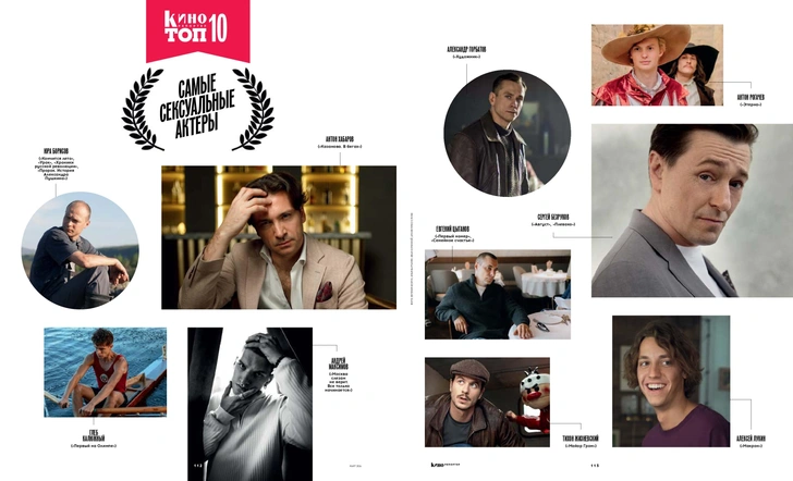 Мужская десятка столь же многогранна. Фирменная интеллектуальная сдержанность Евгения Цыганова в сериале «Первый номер» притягивает внутренней силой, а лиричная и чувственная роль в фильме «Семейное счастье» еще раз подтвердила его способность тонко раскрывать душевные переживания, благодаря чему актер и попал в рейтинг.