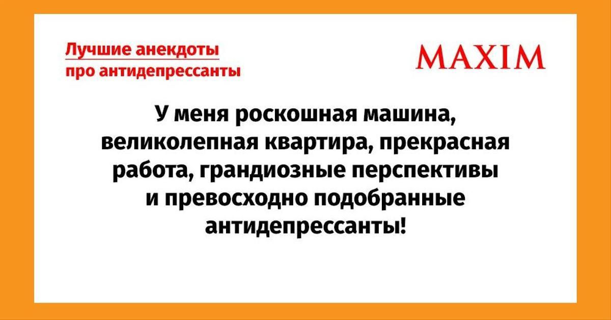 В ряде календарей День антидепрессантов отмечается 15 декабря. MAXIM по такому случаю принял меры. Собрали лучшие и самые смешные анекдоты про антидепрессанты! Принимайте их не всерьез — и вы не будете принимать ничего близко к сердцу!
