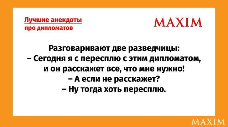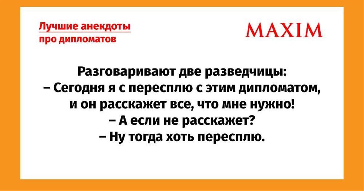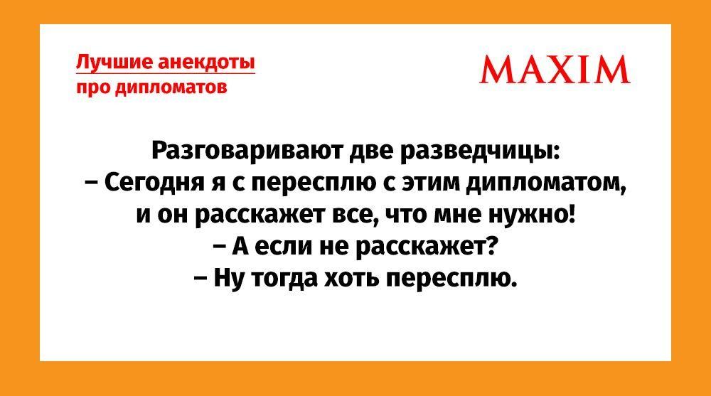 Какая разница между дипломатом и девушкой? Если дипломат говорит «да», это означает «может быть». Если дипломат говорит «может быть», это означает «нет». Если дипломат говорит «нет», то что же это за дипломат?!