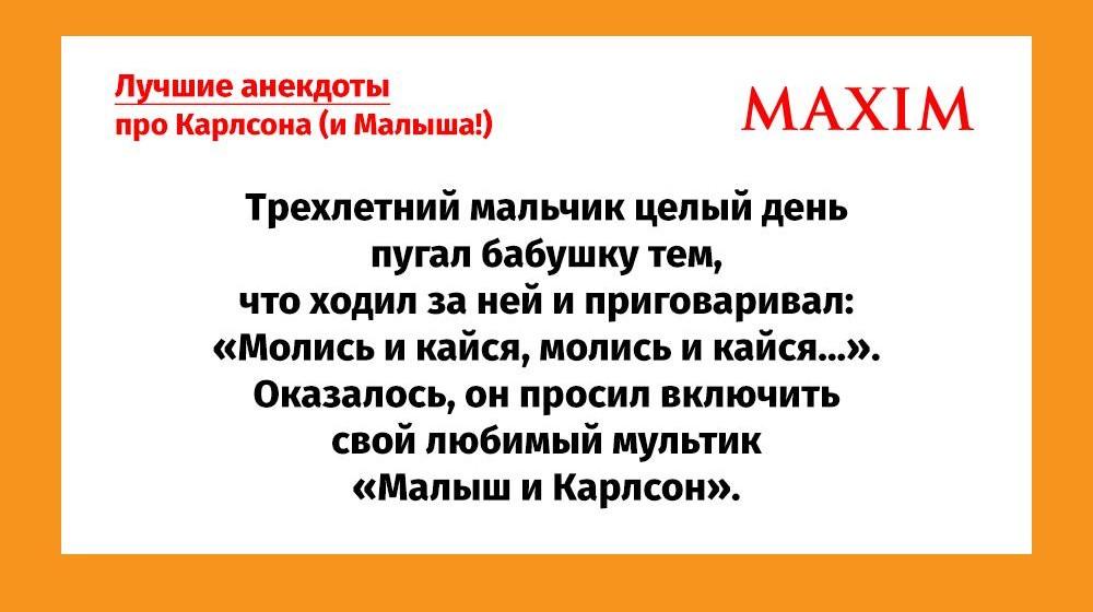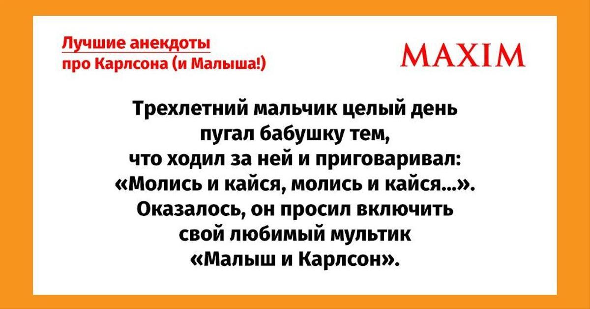 Трехлетний мальчик целый день пугал бабушку тем, что ходил за ней и приговаривал: «Молись и кайся, молись и кайся…» Оказалось, он просил включить свой любимый мультик «Малыш и Карлсон».