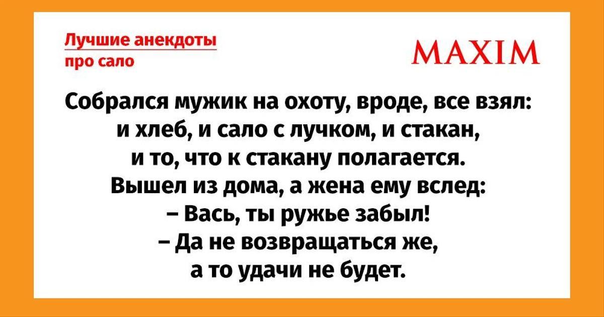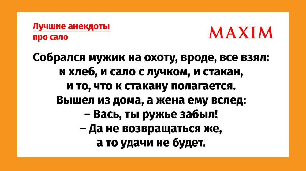 Нет повода не вздрогнуть: день рождения празднует лучший друг водки, яичницы и мужика — сало. Некоторые источники утверждают, что он 18 ноября. Большинство сообщает: День сала — 8 декабря. Но такой повод не грех отметить дважды! Для пущего настроения MAXIM собрал для вас самые смешные анекдоты про сало.