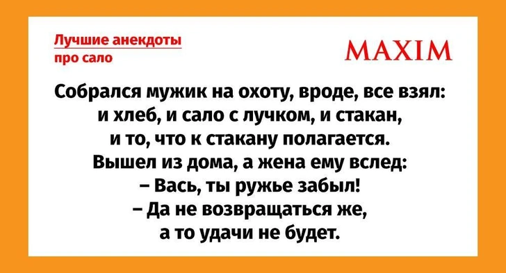 Собрался мужик на охоту, вроде все взял: и хлеб, и сало с лучком, и стакан, и то, что к стакану полагается. Вышел из дома, а жена ему вслед: