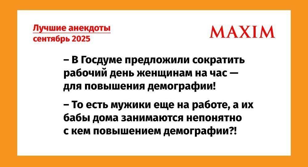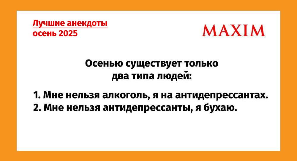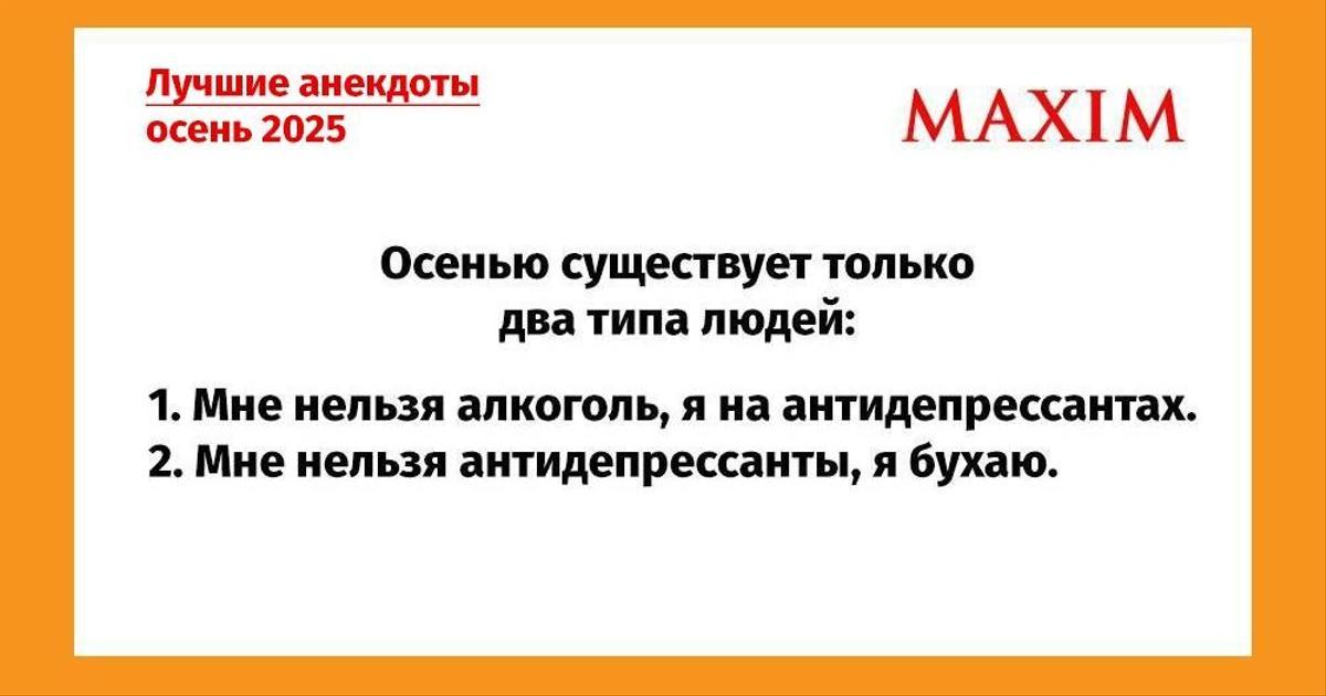 Самые смешные анекдоты за осень 2025 годаРазвлеченияИменно они до слез нас смешили этой осенью! 29 ноября 2025ОбсудитьИсточник: MAXIMИсточник: MAXIMСамые смешные анекдоты за сентябрь 2025 годаИсточник: MAXIMСамые смешные анекдоты в октябре 2025 годаИсточник: MAXIMСамые смешные анекдоты за ноябрь 2025 годаюморанекдоты