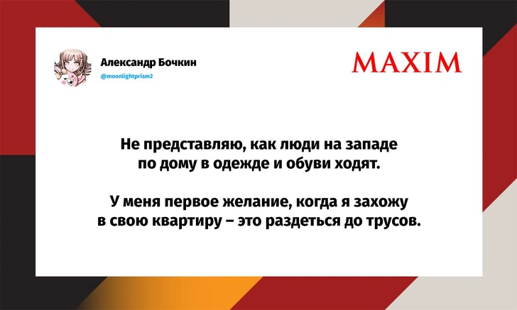Вот уже несколько лет все мы живем в «исторические времена». Единственное, что нас отвлекает, — это юмор, в том числе шутки из «Твиттера» (X). Русскоязычные пользователи каждый день выходят в эту лаконичную соцсеть, преодолевая запреты и блокировки, чтобы потешить самих себя и друг друга. А мы в MAXIM каждый будний день неустанно несем вахту, собирая их лучшие текстово-визуальные юморески.