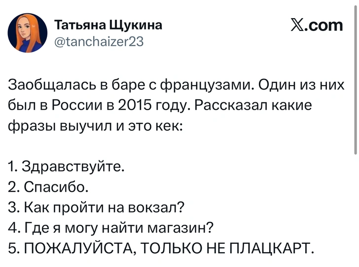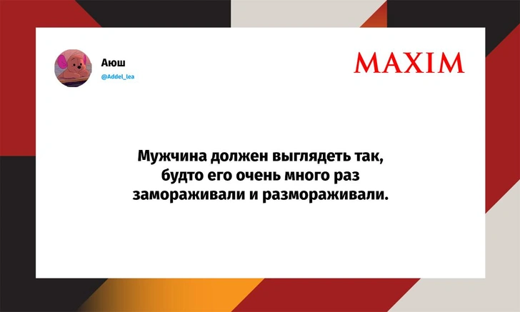 Вот уже несколько лет все мы живем в «исторические времена». Единственное, что нас отвлекает, — это юмор, в том числе шутки из «Твиттера» (X). Русскоязычные пользователи каждый день выходят в эту лаконичную соцсеть, преодолевая запреты и блокировки, чтобы потешить самих себя и друг друга. А мы в MAXIM каждый будний день неустанно несем вахту, собирая их лучшие текстово-визуальные юморески.