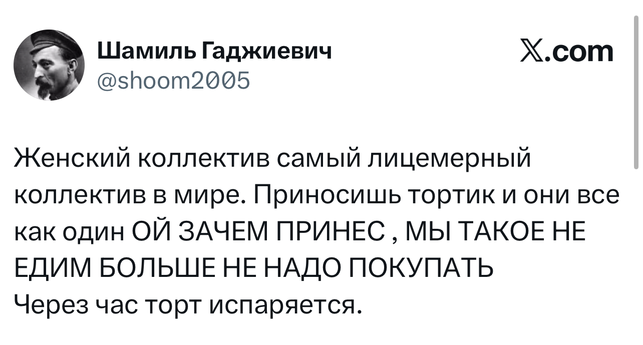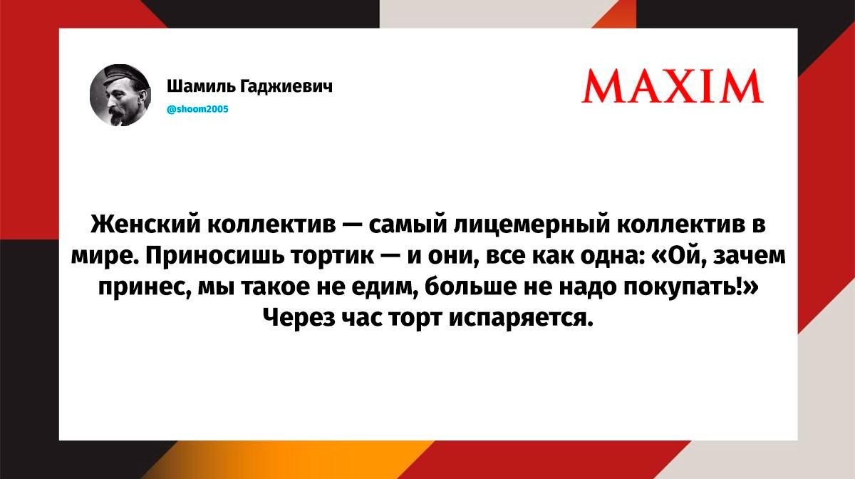 Вот уже несколько лет все мы живем в «исторические времена». Единственное, что нас отвлекает, — это юмор, в том числе шутки из «Твиттера» (X). Русскоязычные пользователи каждый день выходят в эту лаконичную соцсеть, преодолевая запреты и блокировки, чтобы потешить самих себя и друг друга. А мы в MAXIM каждый будний день неустанно несем вахту, собирая их лучшие текстово-визуальные юморески.
