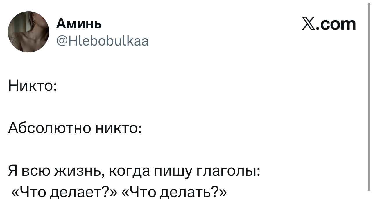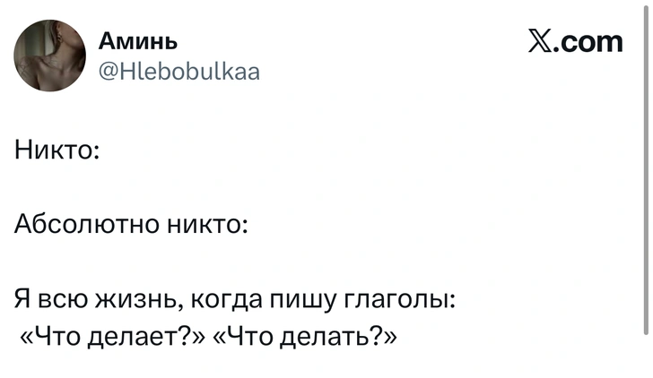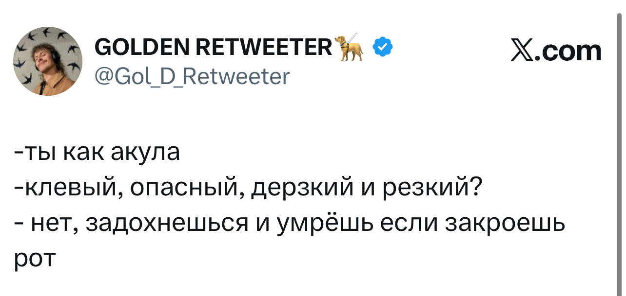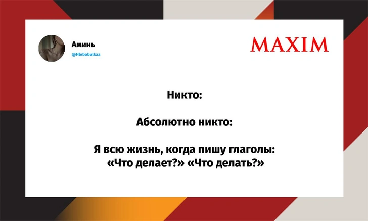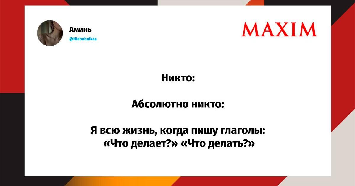 Вот уже несколько лет все мы живем в «исторические времена». Единственное, что нас отвлекает, — это юмор, в том числе шутки из «Твиттера» (X). Русскоязычные пользователи каждый день выходят в эту лаконичную соцсеть, преодолевая запреты и блокировки, чтобы потешить самих себя и друг друга. А мы в MAXIM каждый будний день неустанно несем вахту, собирая их лучшие текстово-визуальные юморески.