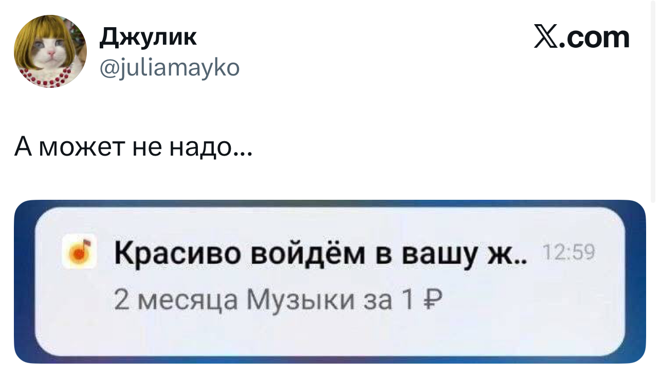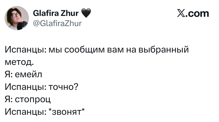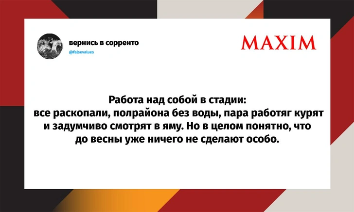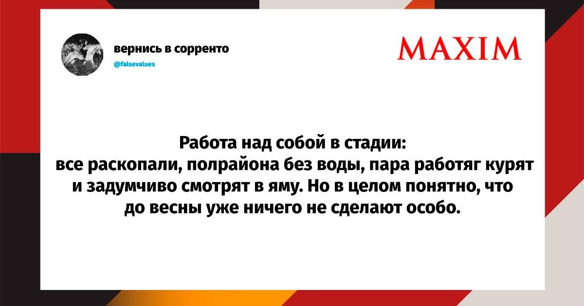 Вот уже несколько лет все мы живем в «исторические времена». Единственное, что нас отвлекает, — это юмор, в том числе шутки из «Твиттера» (X). Русскоязычные пользователи каждый день выходят в эту лаконичную соцсеть, преодолевая запреты и блокировки, чтобы потешить самих себя и друг друга. А мы в MAXIM каждый будний день неустанно несем вахту, собирая их лучшие текстово-визуальные юморески.