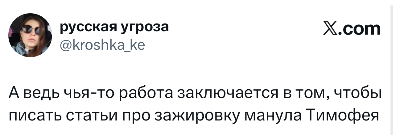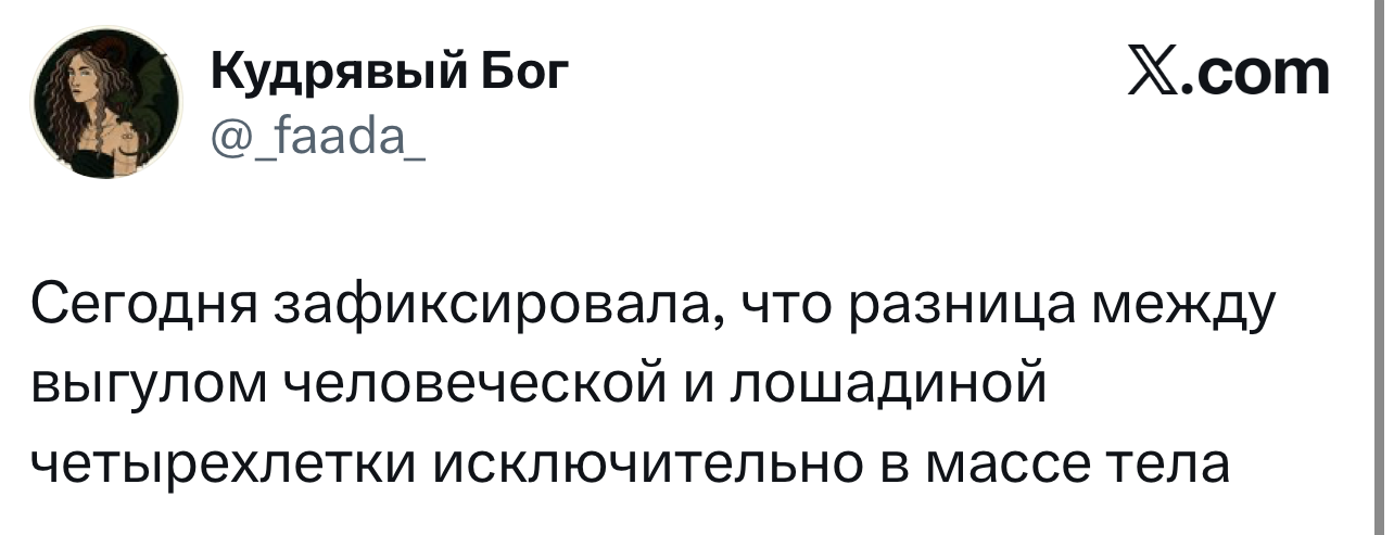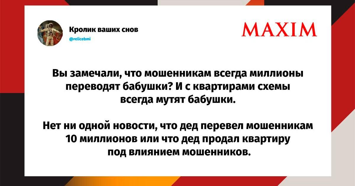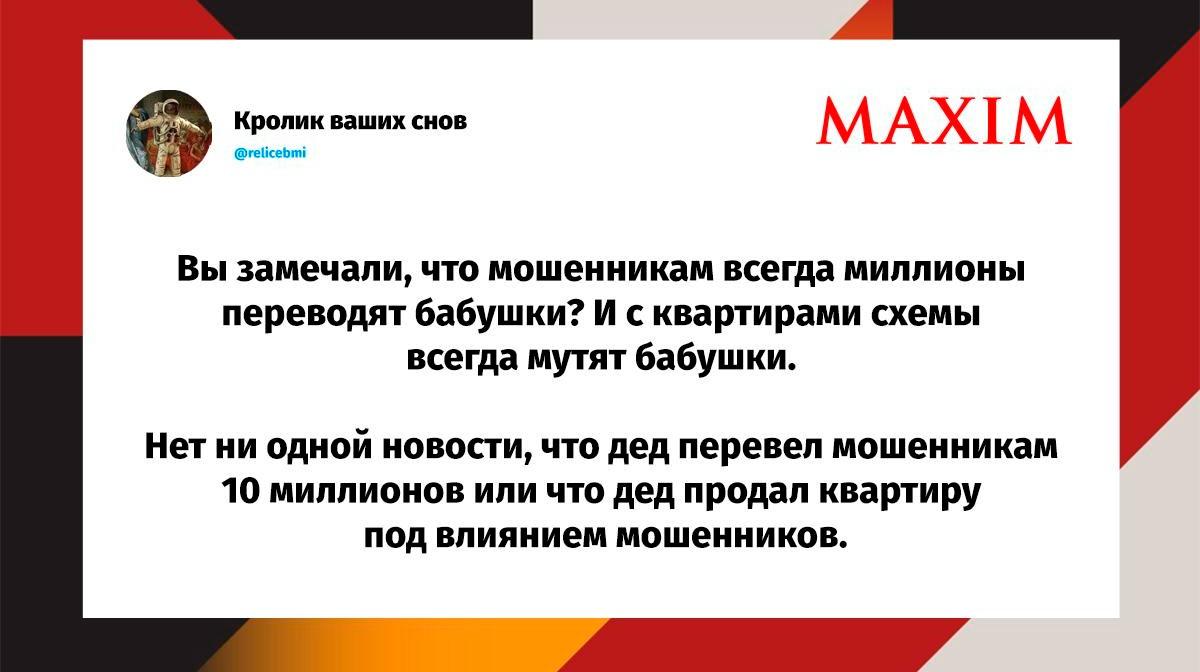 Вот уже несколько лет все мы живем в «исторические времена». Единственное, что нас отвлекает, — это юмор, в том числе шутки из «Твиттера» (X). Русскоязычные пользователи каждый день выходят в эту лаконичную соцсеть, преодолевая запреты и блокировки, чтобы потешить самих себя и друг друга. А мы в MAXIM каждый будний день неустанно несем вахту, собирая их лучшие текстово-визуальные юморески.