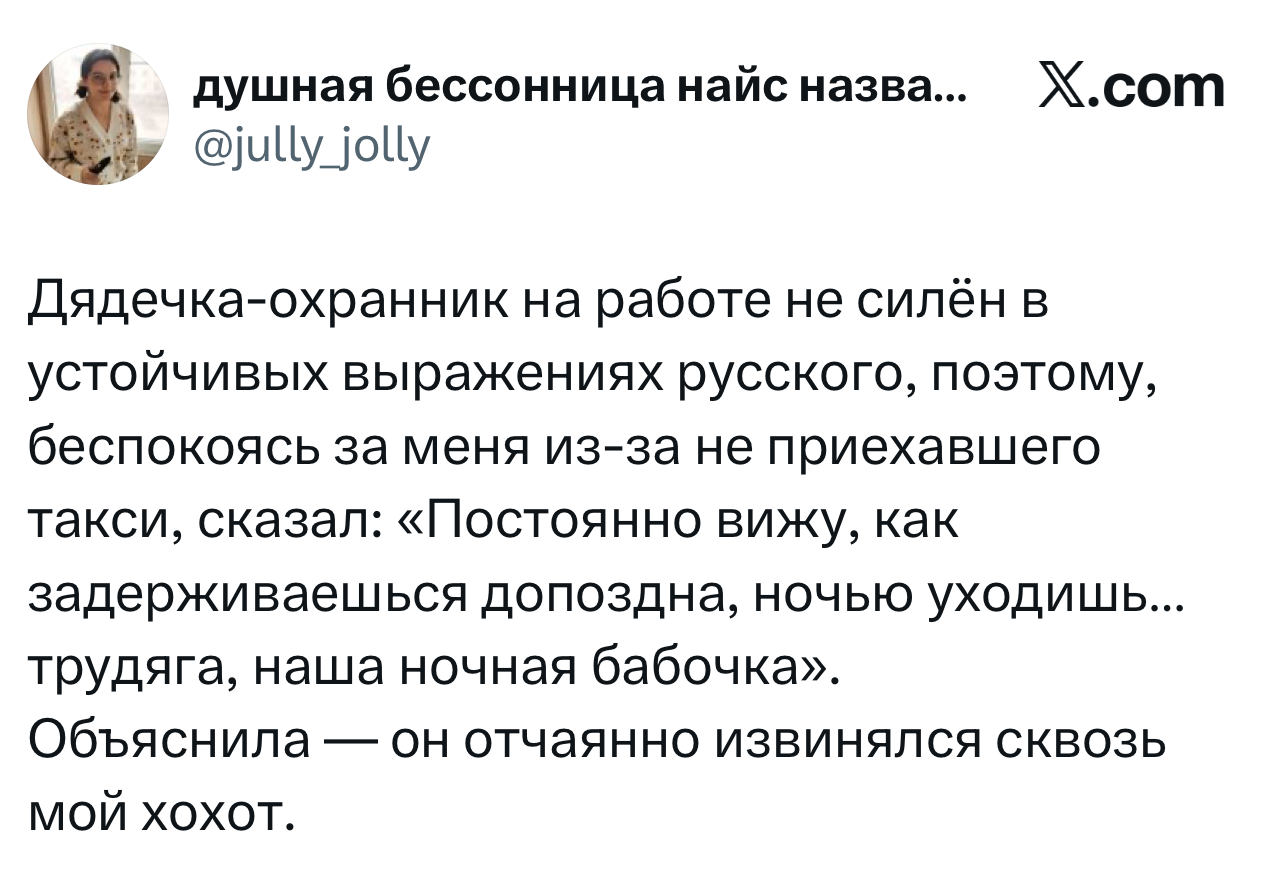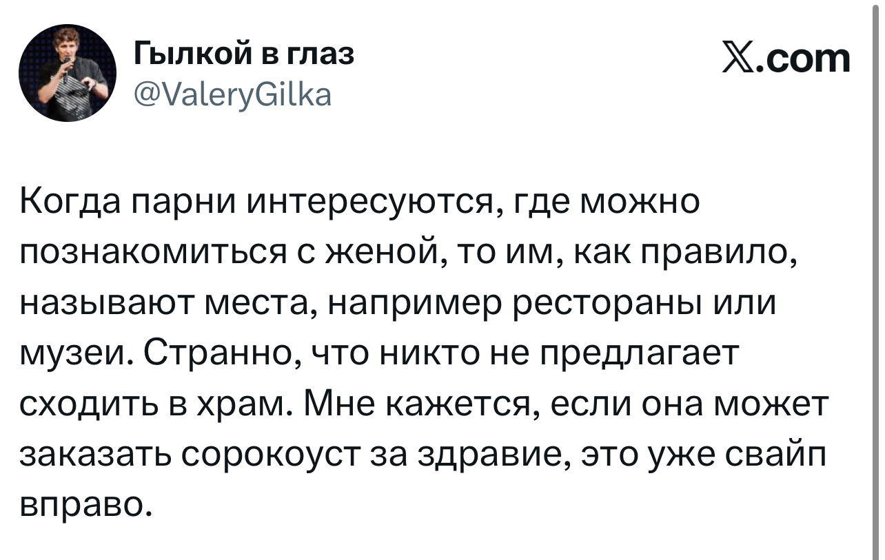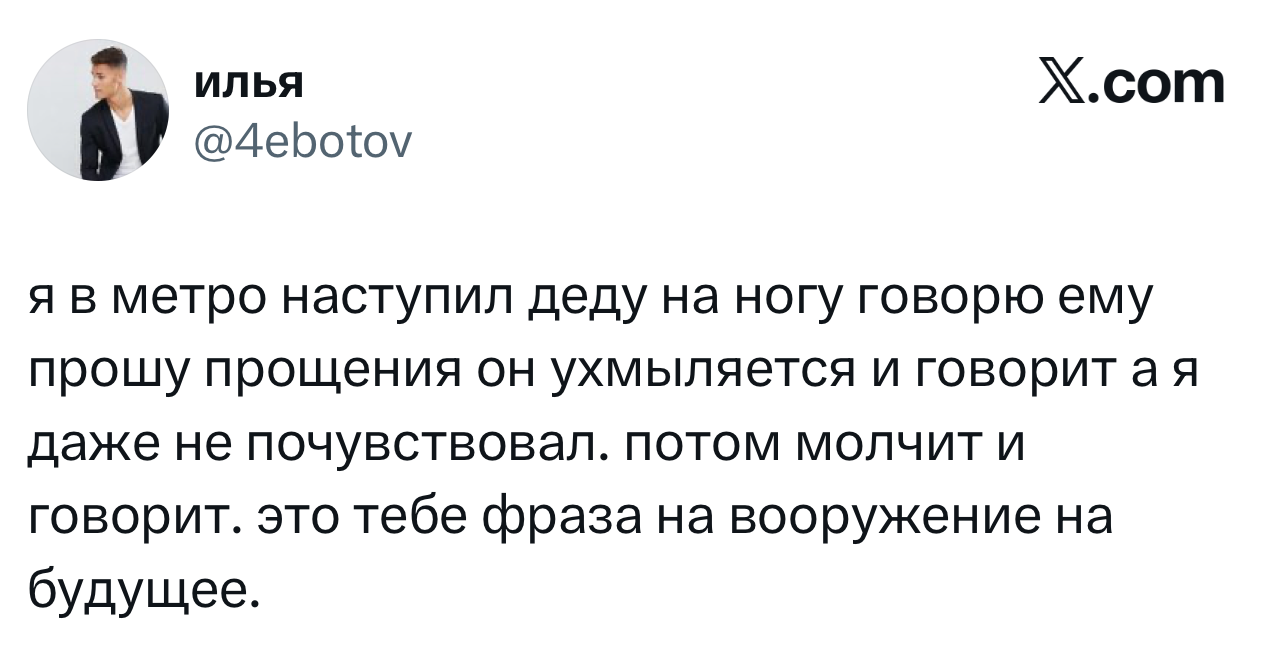 Вот уже несколько лет все мы живем в «исторические времена». Единственное, что нас отвлекает, — это юмор, в том числе шутки из «Твиттера» (X). Русскоязычные пользователи каждый день выходят в эту лаконичную соцсеть, преодолевая запреты и блокировки, чтобы потешить самих себя и друг друга. А мы в MAXIM каждый будний день неустанно несем вахту, собирая их лучшие текстово-визуальные юморески.