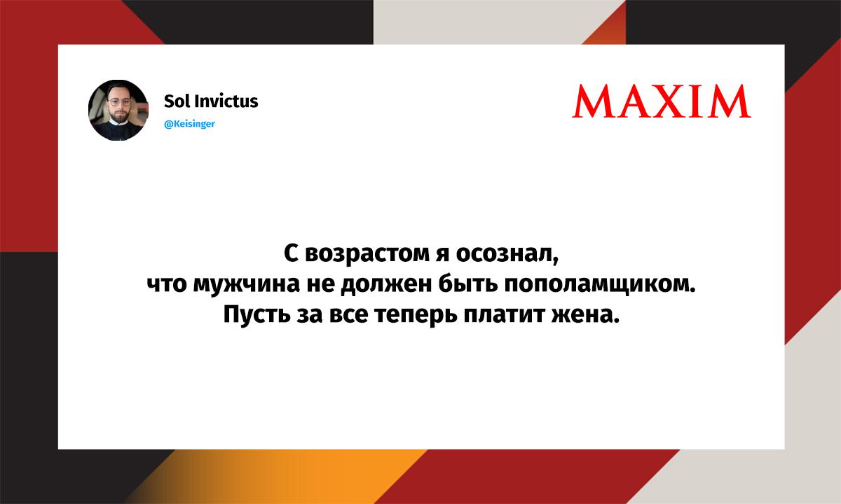 Вот уже несколько лет все мы живем в «исторические времена». Единственное, что нас отвлекает, — это юмор, в том числе шутки из «Твиттера» (X). Русскоязычные пользователи каждый день выходят в эту лаконичную соцсеть, преодолевая запреты и блокировки, чтобы потешить самих себя и друг друга. А мы в MAXIM каждый будний день неустанно несем вахту, собирая их лучшие текстово-визуальные юморески.