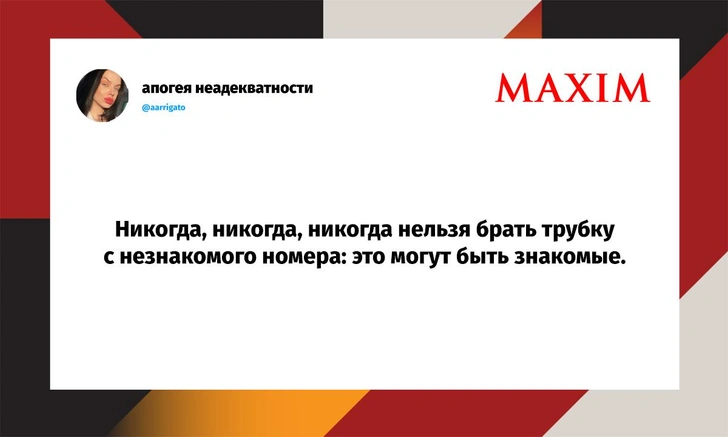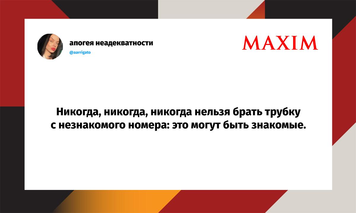 Вот уже несколько лет все мы живем в «исторические времена». Единственное, что нас отвлекает, — это юмор, в том числе шутки из «Твиттера» (X). Русскоязычные пользователи каждый день выходят в эту лаконичную соцсеть, преодолевая запреты и блокировки, чтобы потешить самих себя и друг друга. А мы в MAXIM каждый будний день неустанно несем вахту, собирая их лучшие текстово-визуальные юморески.