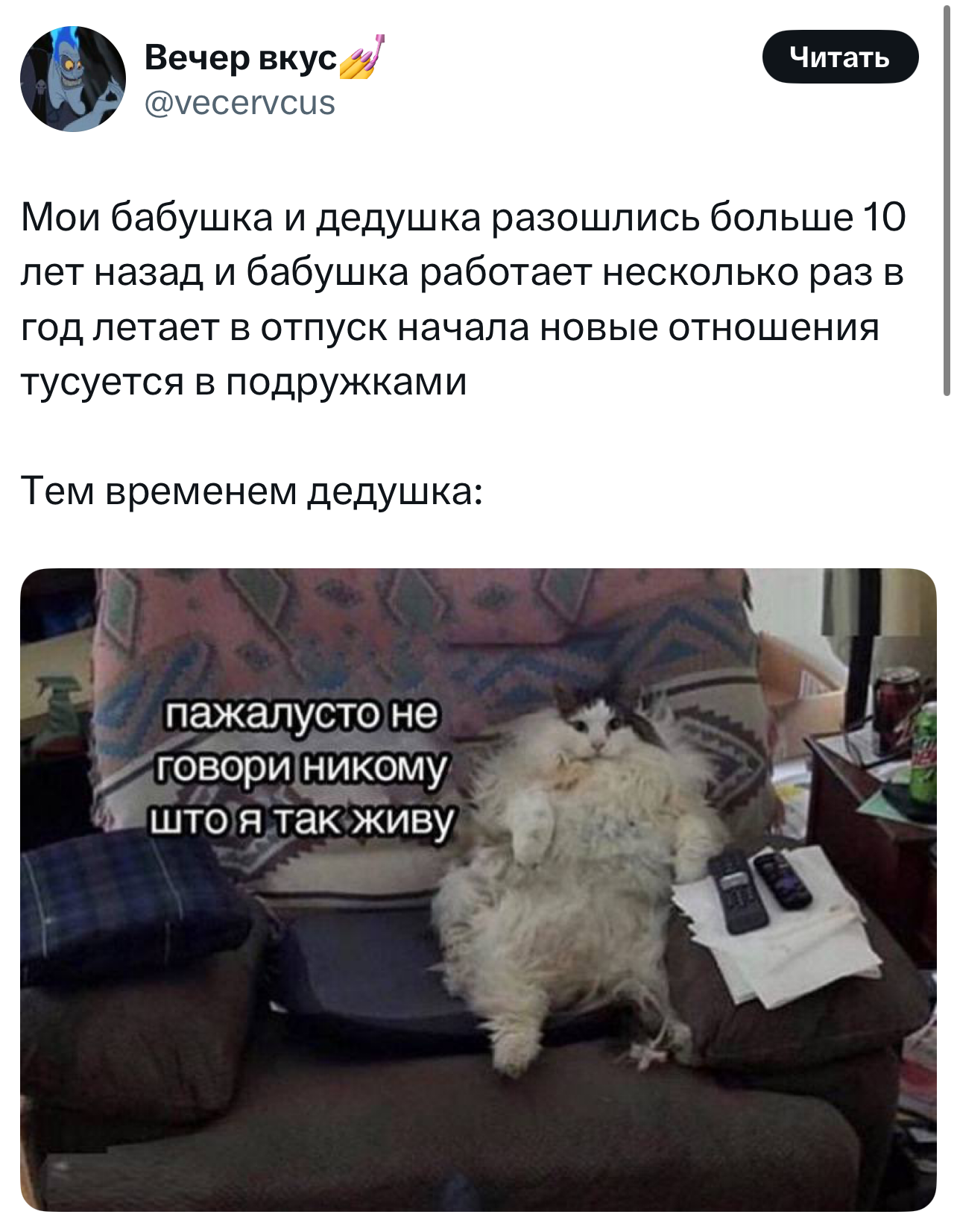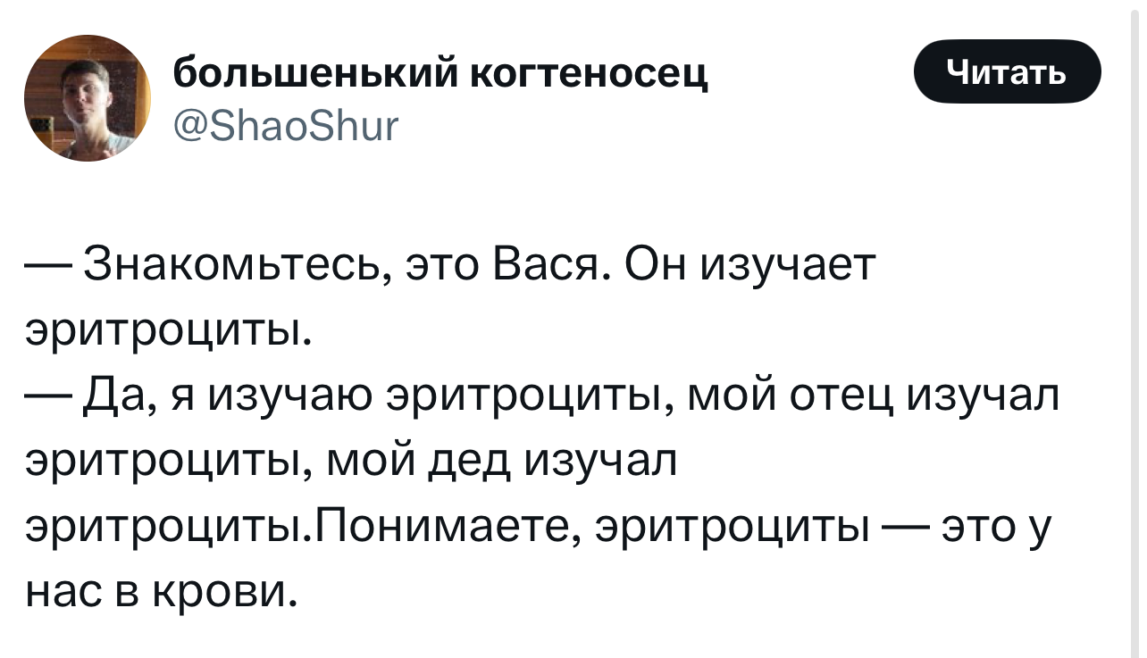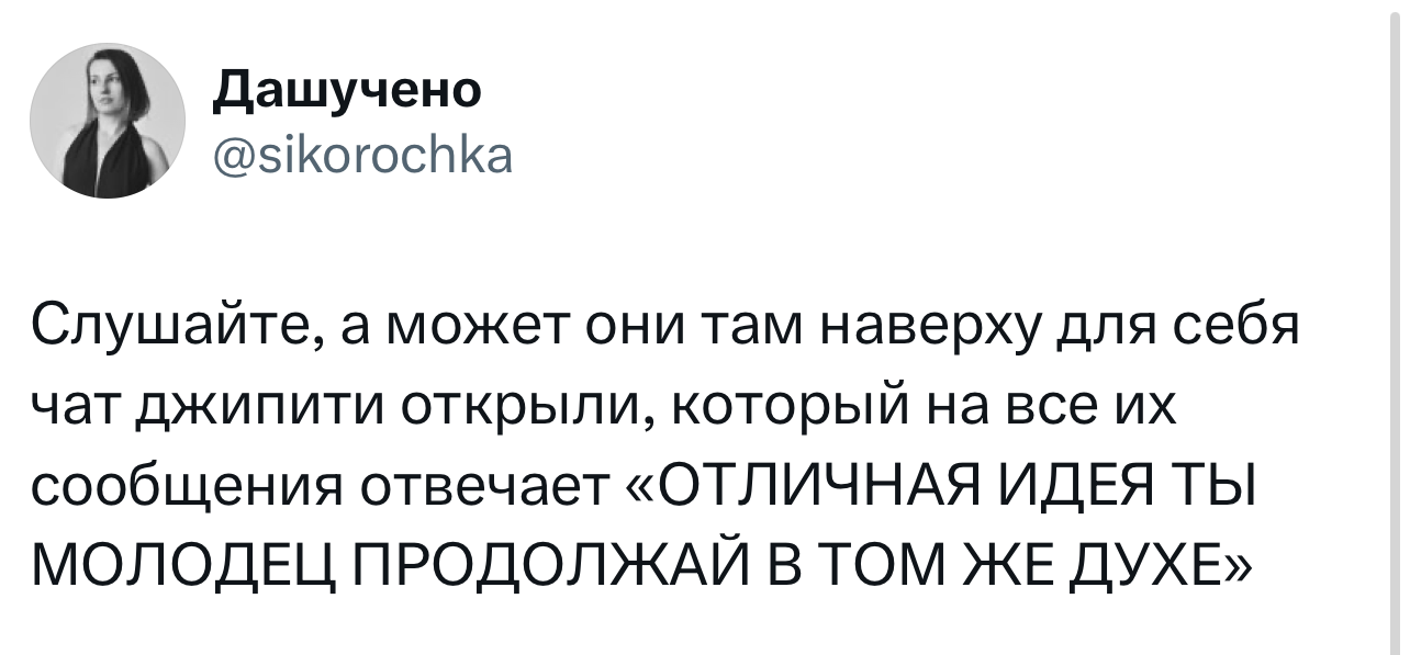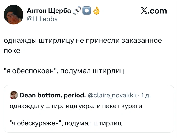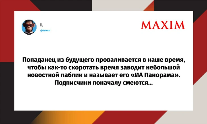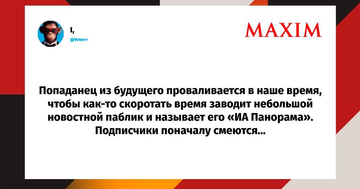Вот уже несколько лет все мы живем в «исторические времена». Единственное, что нас отвлекает, — это юмор, в том числе шутки из «Твиттера» (X). Русскоязычные пользователи каждый день выходят в эту лаконичную соцсеть, преодолевая запреты и блокировки, чтобы потешить самих себя и друг друга. А мы в MAXIM каждый будний день неустанно несем вахту, собирая их лучшие текстово-визуальные юморески.