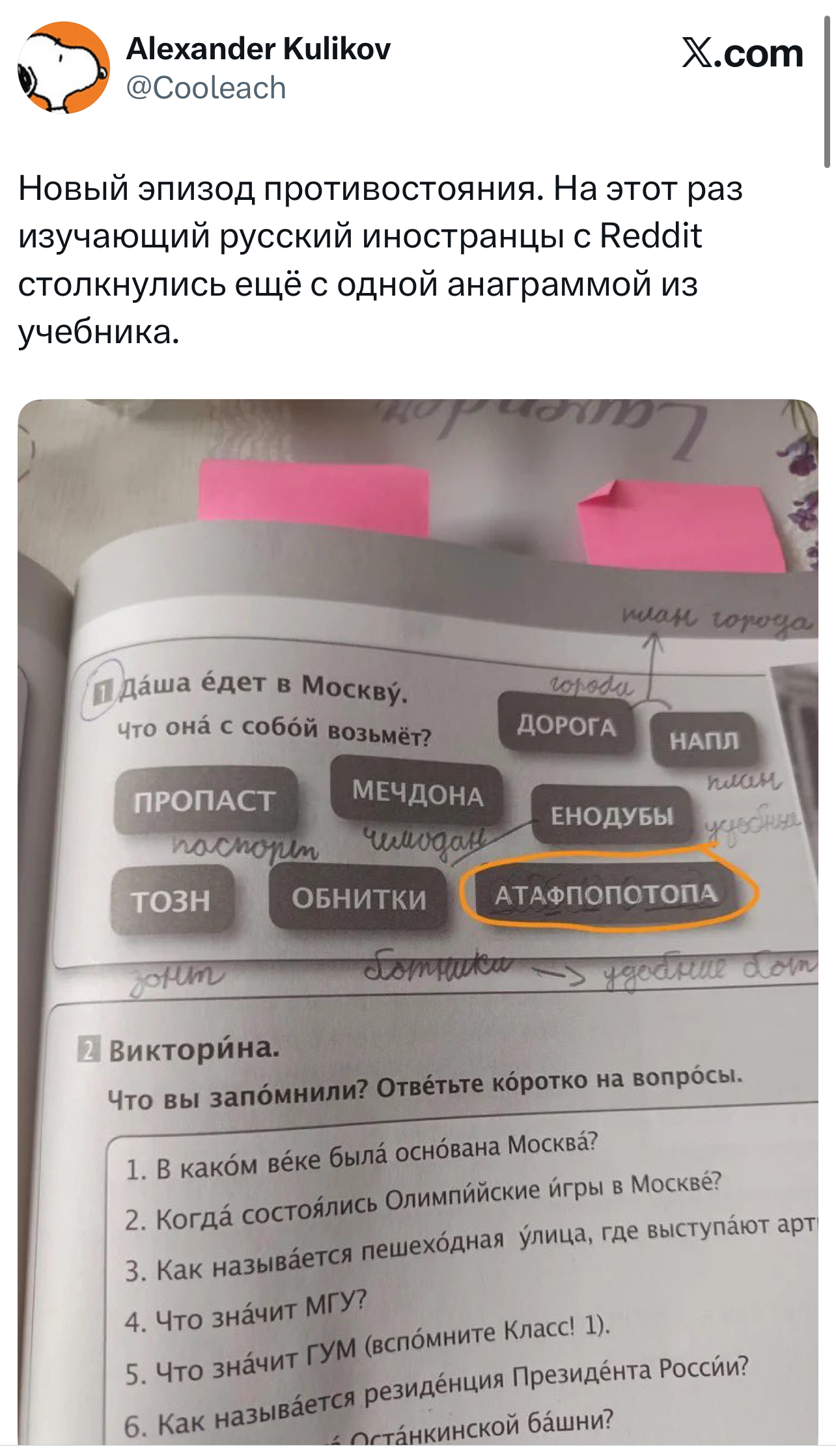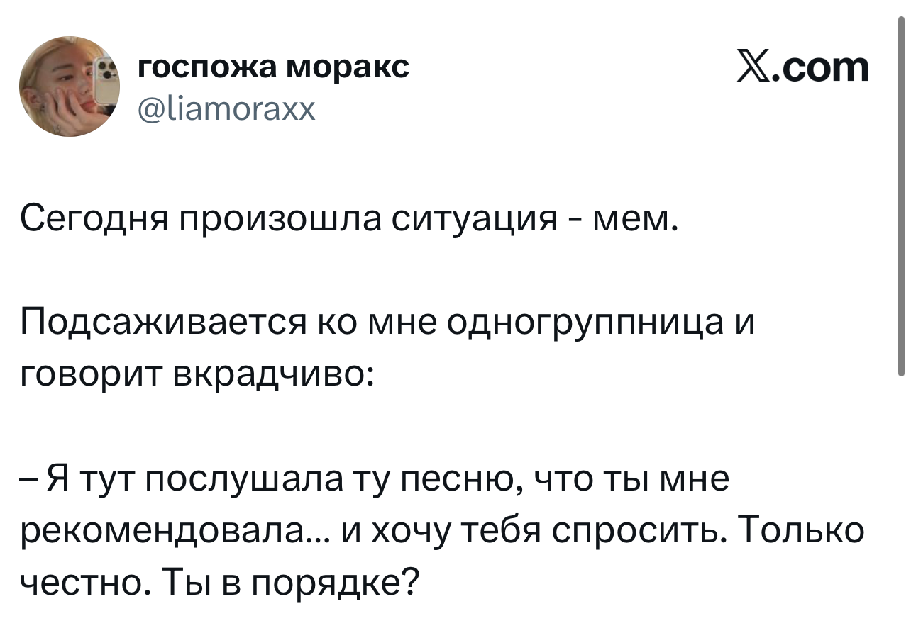 Вот уже несколько лет все мы живем в «исторические времена». Единственное, что нас отвлекает, — это юмор, в том числе шутки из «Твиттера» (X). Русскоязычные пользователи каждый день выходят в эту лаконичную соцсеть, преодолевая запреты и блокировки, чтобы потешить самих себя и друг друга. А мы в MAXIM каждый будний день неустанно несем вахту, собирая их лучшие текстово-визуальные юморески.