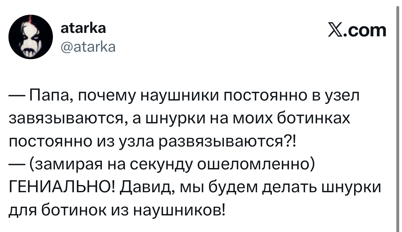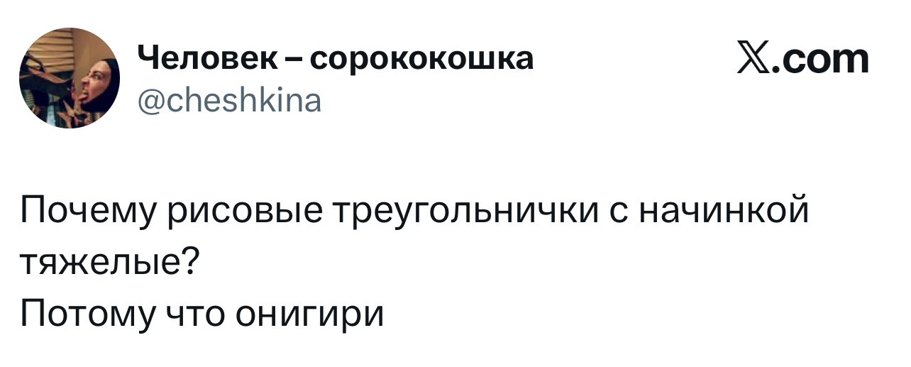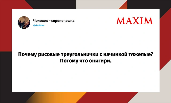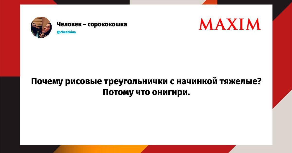 Вот уже несколько лет все мы живем в «исторические времена». Единственное, что нас отвлекает, — это юмор, в том числе шутки из «Твиттера» (X). Русскоязычные пользователи каждый день выходят в эту лаконичную соцсеть, преодолевая запреты и блокировки, чтобы потешить самих себя и друг друга. А мы в MAXIM каждый будний день неустанно несем вахту, собирая их лучшие текстово-визуальные юморески.