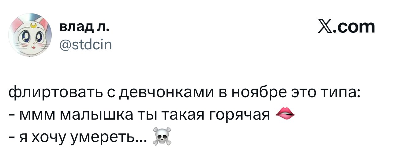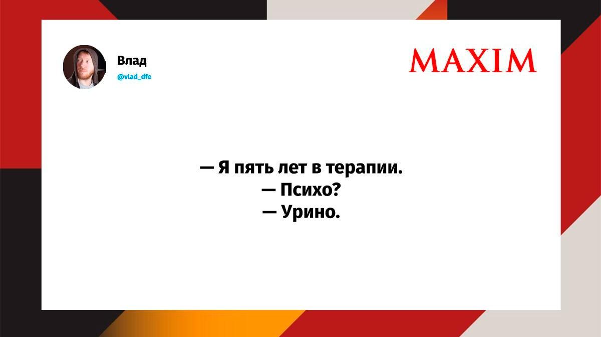 Вот уже несколько лет все мы живем в «исторические времена». Единственное, что нас отвлекает, — это юмор, в том числе шутки из «Твиттера» (X). Русскоязычные пользователи каждый день выходят в эту лаконичную соцсеть, преодолевая запреты и блокировки, чтобы потешить самих себя и друг друга. А мы в MAXIM каждый будний день неустанно несем вахту, собирая их лучшие текстово-визуальные юморески.