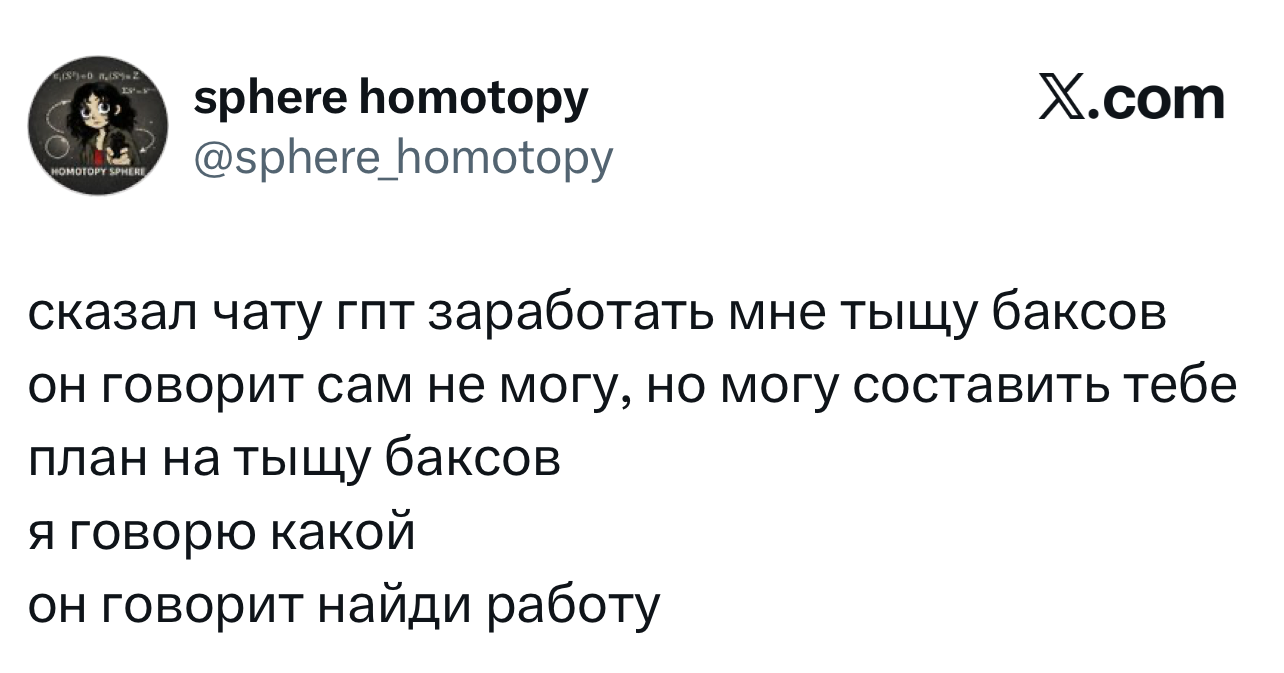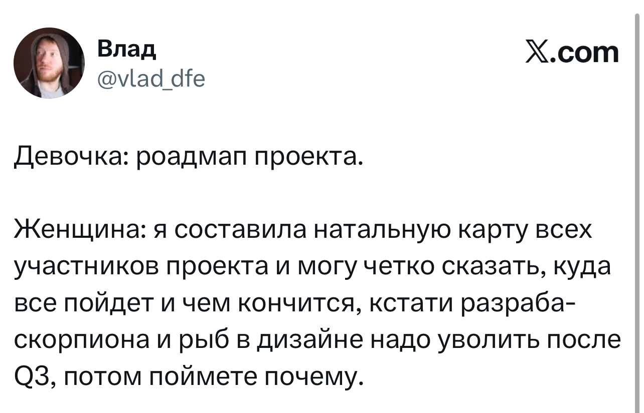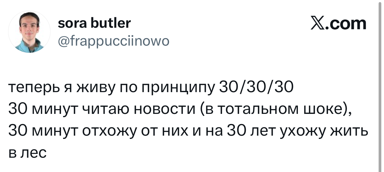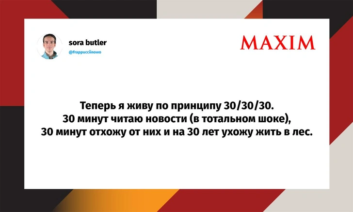 Вот уже несколько лет все мы живем в «исторические времена». Единственное, что нас отвлекает, — это юмор, в том числе шутки из «Твиттера» (X). Русскоязычные пользователи каждый день выходят в эту лаконичную соцсеть, преодолевая запреты и блокировки, чтобы потешить самих себя и друг друга. А мы в MAXIM каждый будний день неустанно несем вахту, собирая их лучшие текстово-визуальные юморески.