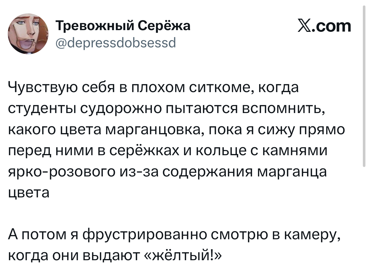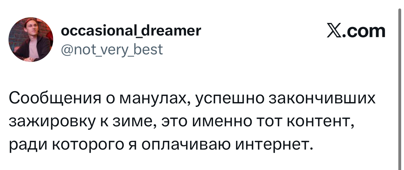 Вот уже несколько лет все мы живем в «исторические времена». Единственное, что нас отвлекает, — это юмор, в том числе шутки из «Твиттера» (X). Русскоязычные пользователи каждый день выходят в эту лаконичную соцсеть, преодолевая запреты и блокировки, чтобы потешить самих себя и друг друга. А мы в MAXIM каждый будний день неустанно несем вахту, собирая их лучшие текстово-визуальные юморески.