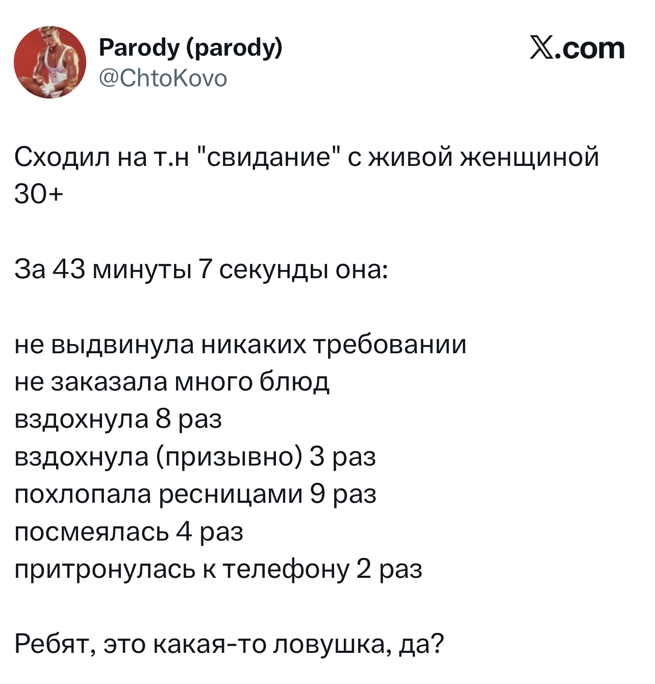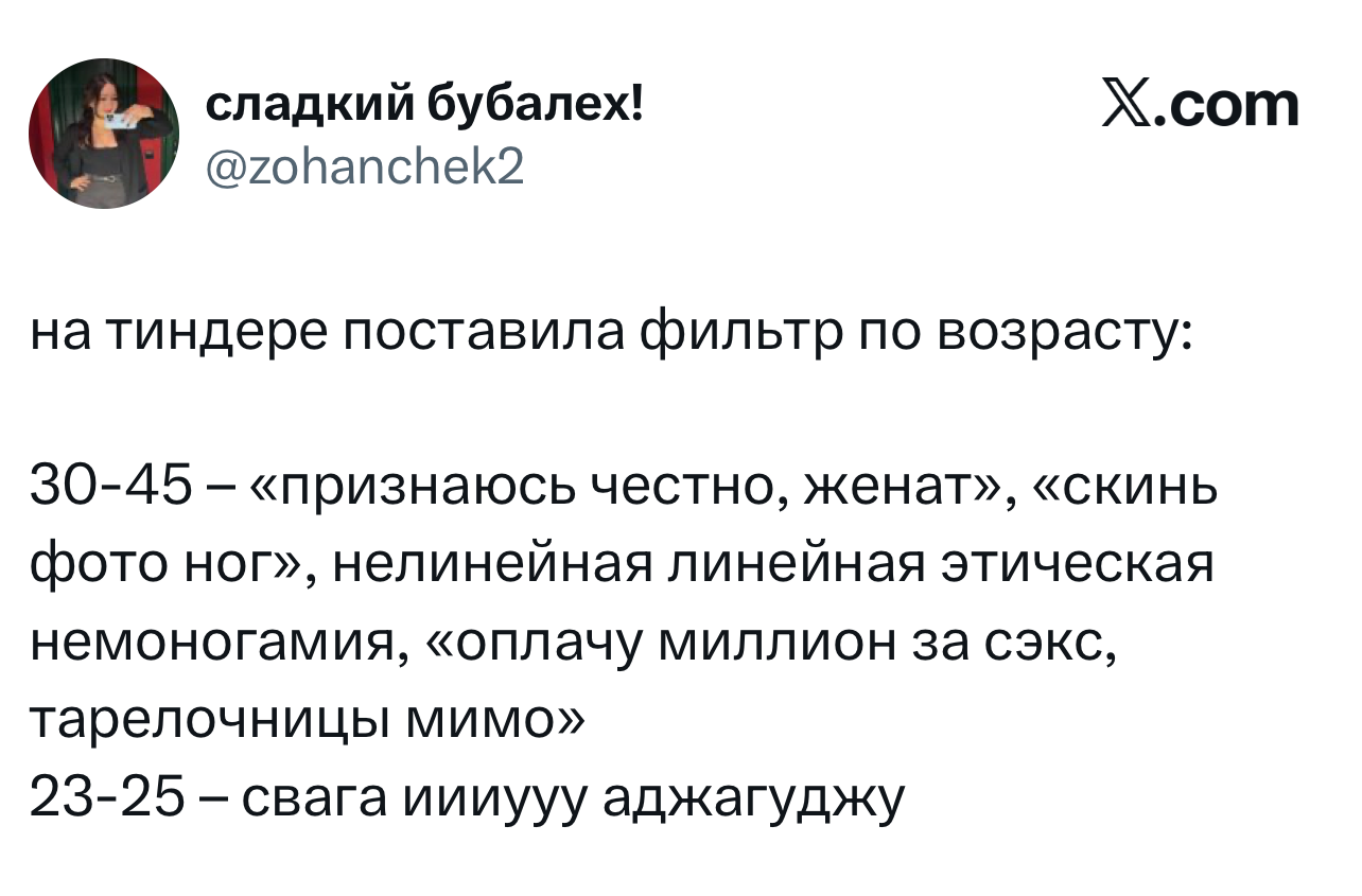 Вот уже несколько лет все мы живем в «исторические времена». Единственное, что нас отвлекает, — это юмор, в том числе шутки из «Твиттера» (X). Русскоязычные пользователи каждый день выходят в эту лаконичную соцсеть, преодолевая запреты и блокировки, чтобы потешить самих себя и друг друга. А мы в MAXIM каждый будний день неустанно несем вахту, собирая их лучшие текстово-визуальные юморески.