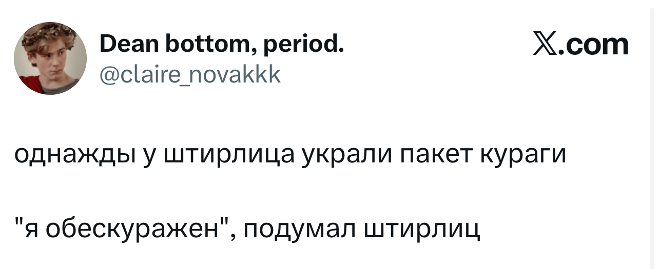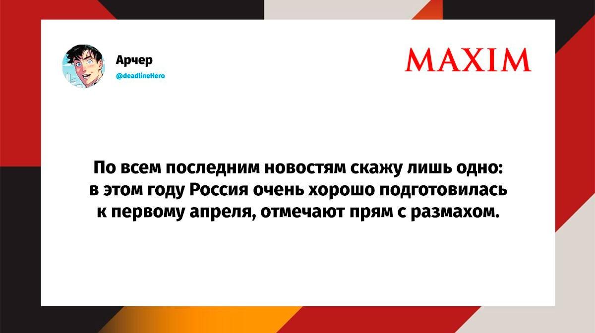 Вот уже несколько лет все мы живем в «исторические времена». Единственное, что нас отвлекает, — это юмор, в том числе шутки из «Твиттера» (X). Русскоязычные пользователи каждый день выходят в эту лаконичную соцсеть, преодолевая запреты и блокировки, чтобы потешить самих себя и друг друга. А мы в MAXIM каждый будний день неустанно несем вахту, собирая их лучшие текстово-визуальные юморески.