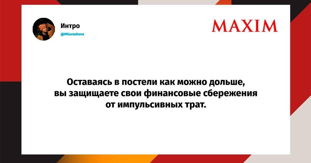 Вот уже несколько лет все мы живем в «исторические времена». Единственное, что нас отвлекает, — это юмор, в том числе шутки из «Твиттера» (X). Русскоязычные пользователи каждый день выходят в эту лаконичную соцсеть, преодолевая запреты и блокировки, чтобы потешить самих себя и друг друга. А мы в MAXIM каждый будний день неустанно несем вахту, собирая их лучшие текстово-визуальные юморески.