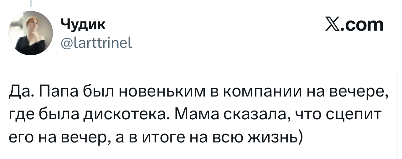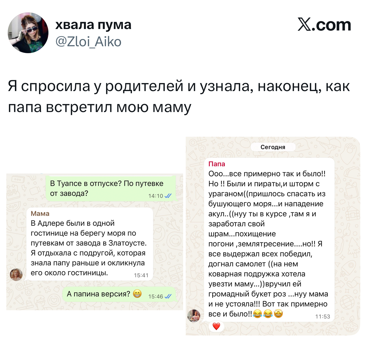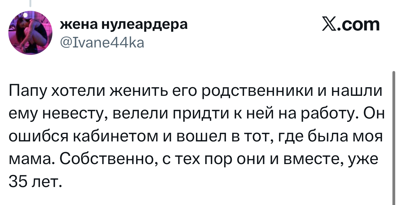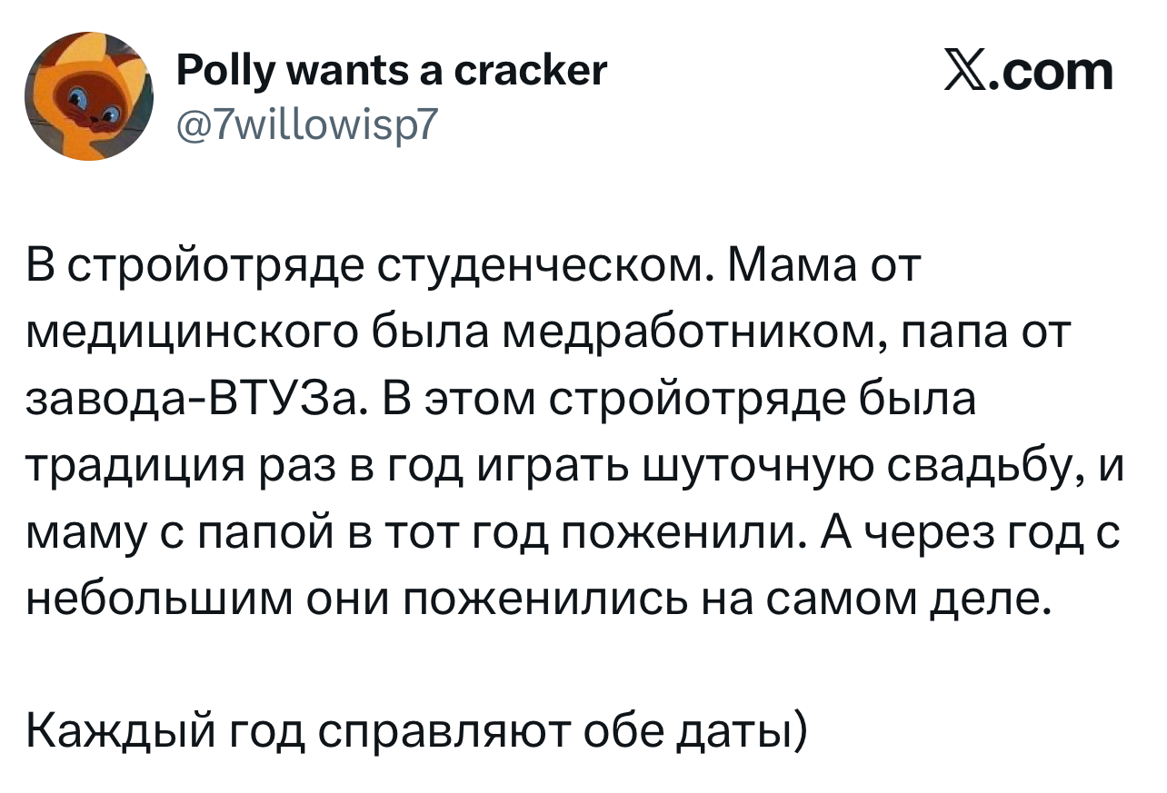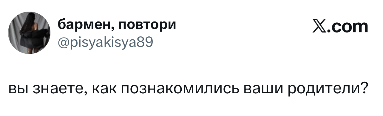 Слава всем богам, что в «Твиттере» (X) кроме скандалов и кринжа все еще появляется что-то интересное! На этот раз пользовательница с ником @pisyakisya 23 ноября 2025 года решила спросить пользователей, как познакомились их родители.