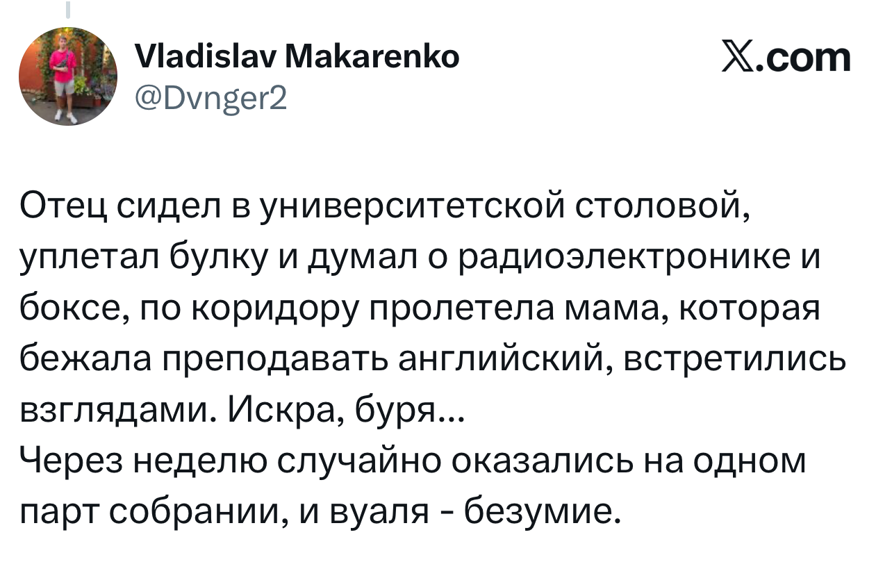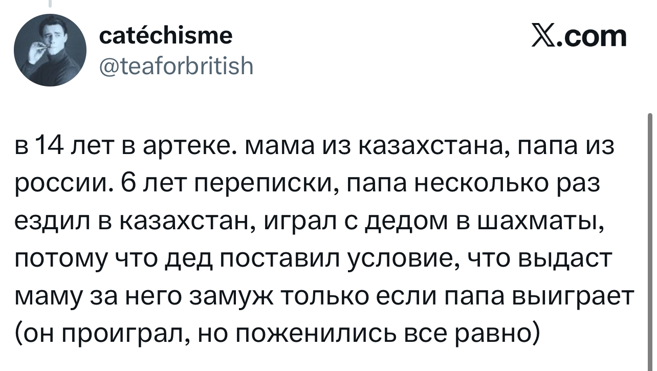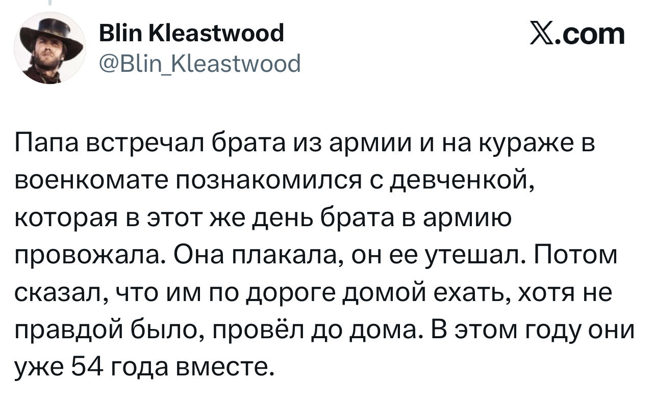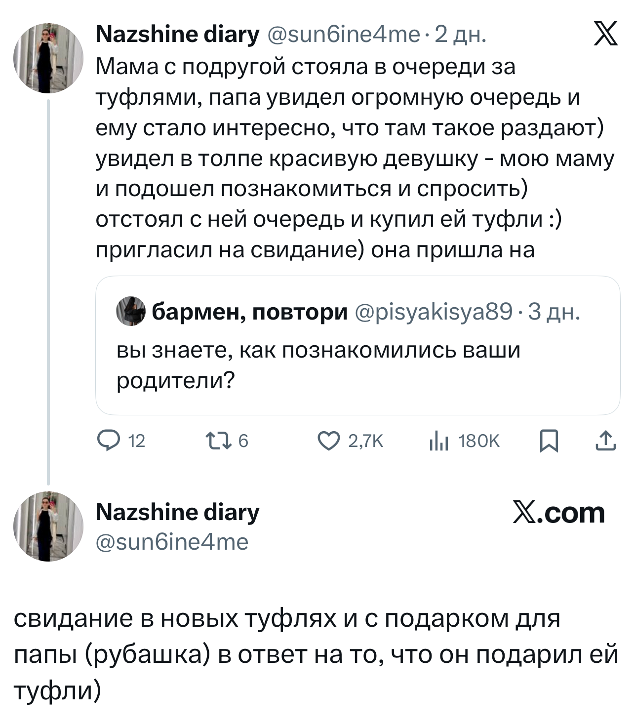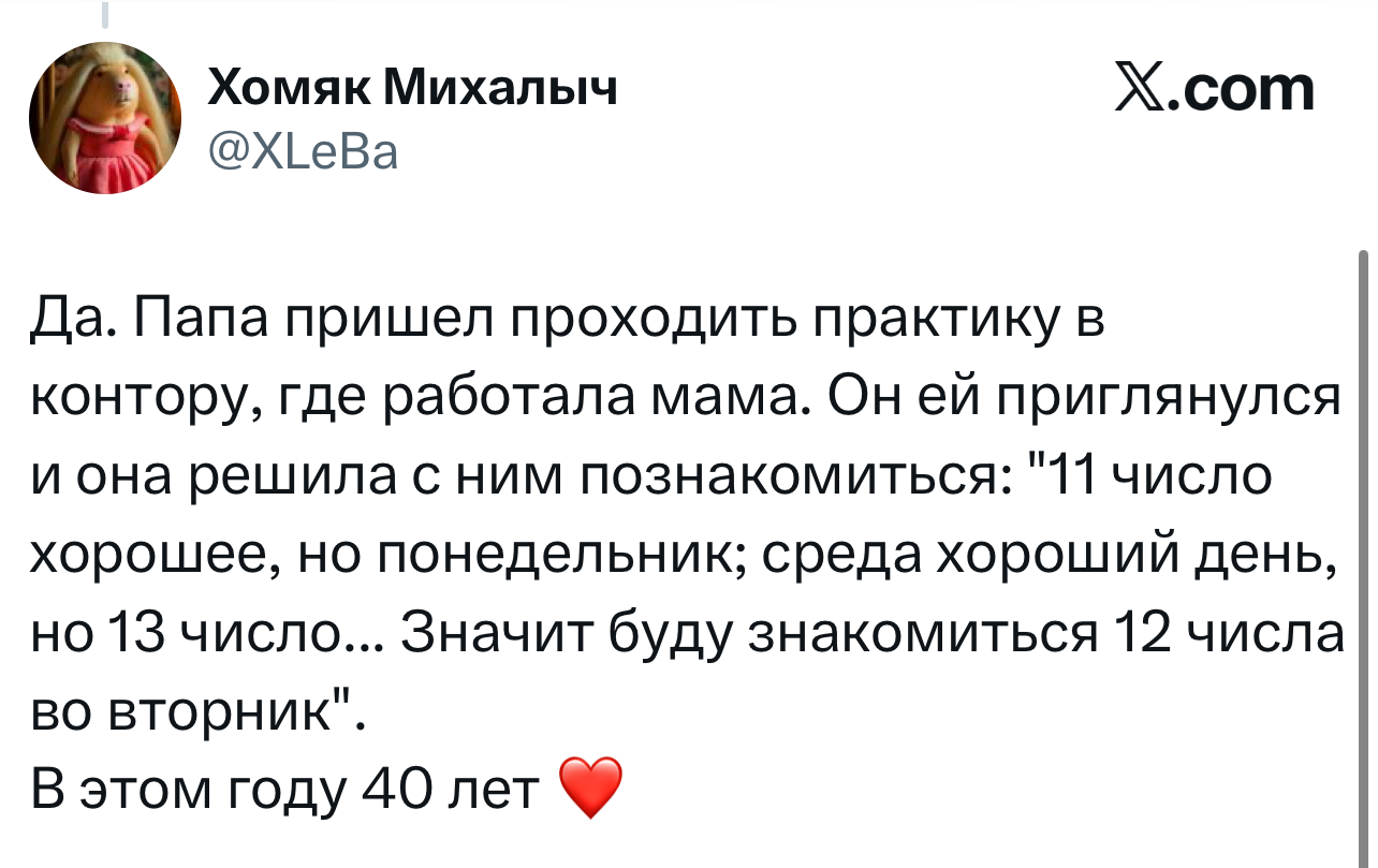 Слава всем богам, что в «Твиттере» (X) кроме скандалов и кринжа все еще появляется что-то интересное! На этот раз пользовательница с ником @pisyakisya 23 ноября 2025 года решила спросить пользователей, как познакомились их родители.
