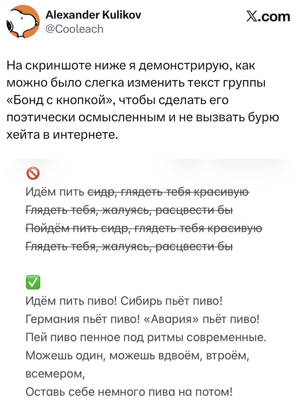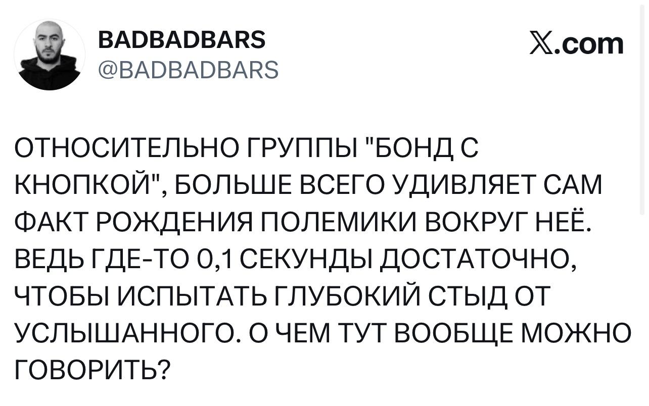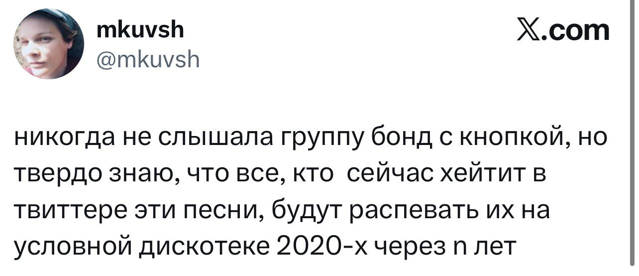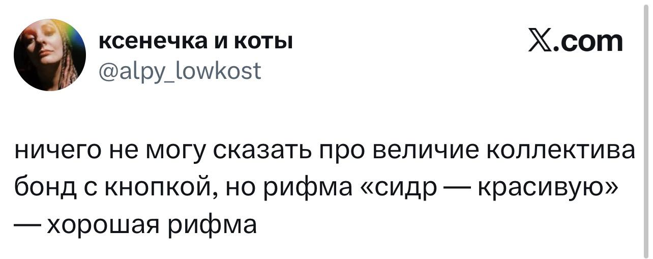 И снова ни дня без скандалов в «Твиттере» (X). На этот раз причиной священной войны в комментариях послужила песня группы «Бонд с кнопкой» — «Сидр». Вертикальное видео с ней завирусилось по всему Интернету, не обойдя и нашу любимую токсичную соцсеть.