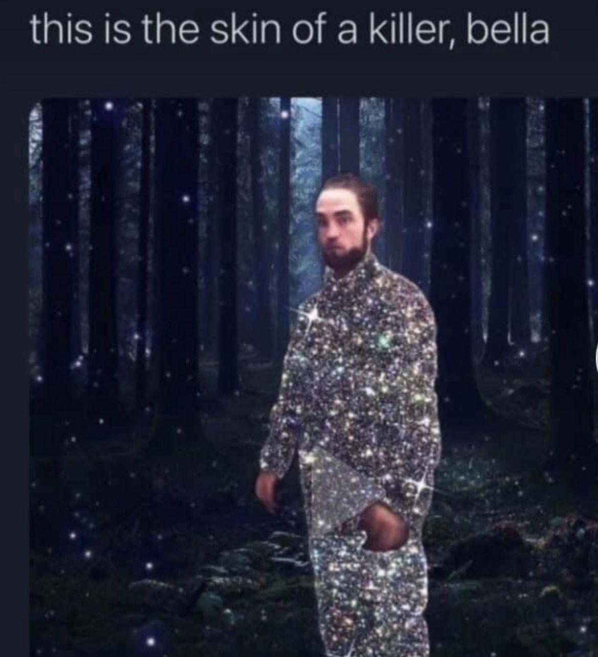 Как в Сети только не обыгрывали этот культовый диалог Эдварда и Беллы: «Твоя кожа… Ты весь светишься. — Это кожа убийцы, Белла!» Кто-то прикреплял лицо Роберта Паттинсона к изображению дискошара, а кто-то представлял свои вариации диалога вроде: «Твоя кожа… Ты весь светишься. — Я просто вспотел».