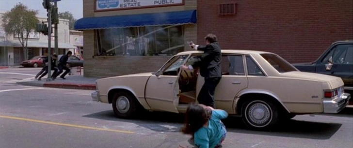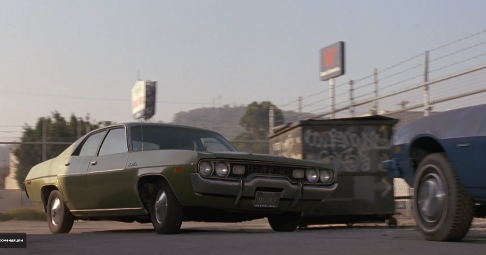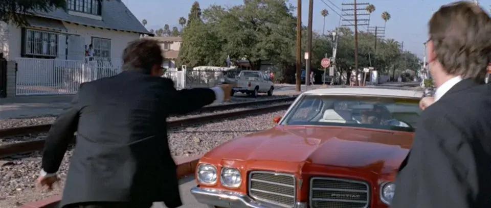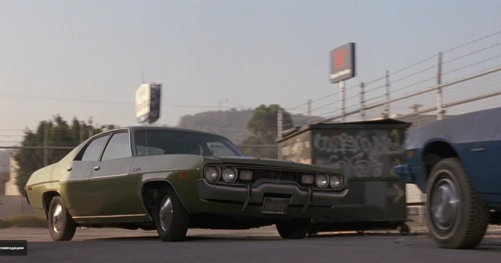 Ближе к финалу фильма в кадр буквально вваливается этот автомобиль с «мистером Бурым» (Тарантино) за рулем — и врезается в припаркованную машину.