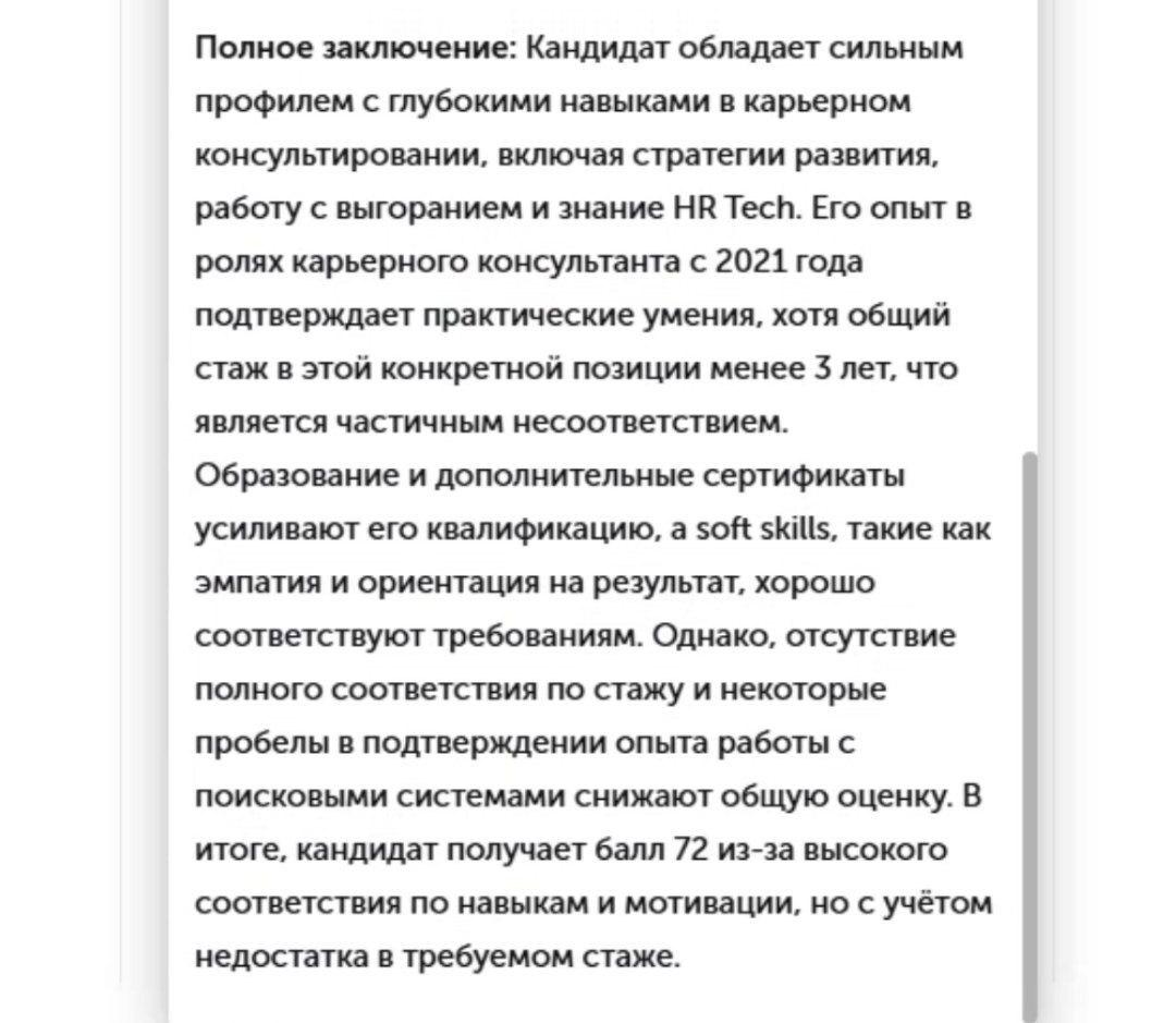 Чтобы проверить не только свое резюме, Алина попросила своих подписчиков прислать ей свои анкеты и вакансии, на которые они получили отказ. Взяв уже другие данные, эксперт загрузила их в «Поток» и выяснила, что одному из кандидатов ИИ также неверно рассчитал стаж. Предположительно из-за того, что в резюме был указан опыт длительной стажировки, искусственный интеллект не посчитал это время за настоящую работу.