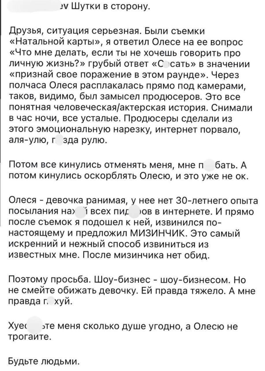 В своем посте Лебедев написал, что в соцсетях на Олесю обрушился хейт после выпуска, и потребовал не трогать ведущую. Также дизайнер упомянул, что выпуск снимали в час ночи и все были уставшие, а Олеся заплакала не после его слов, а через полчаса после того, как он сказал «сосать». И вновь перекинул всю вину на продюсеров, которые якобы хитро смонтировали короткие ролики, спровоцировав скандал.