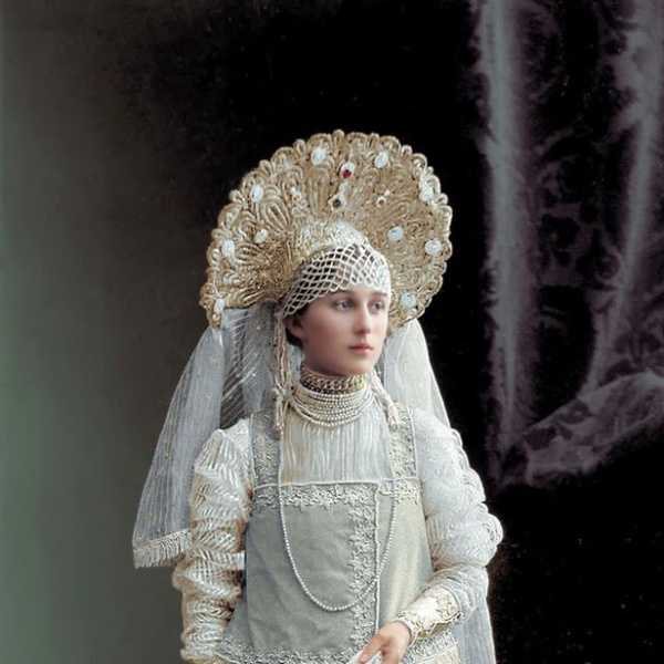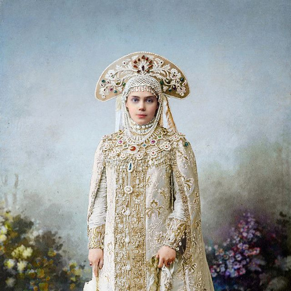 Императорская семья тоже позировала в богатых костюмах XVII века. Николай II в роли Алексея, царица Александра в роли Марии Милославской в Эрмитажном театре. Причем для них не шили костюмы: императорская семья была в бесценных подлинниках, специально привезенных из Кремля.