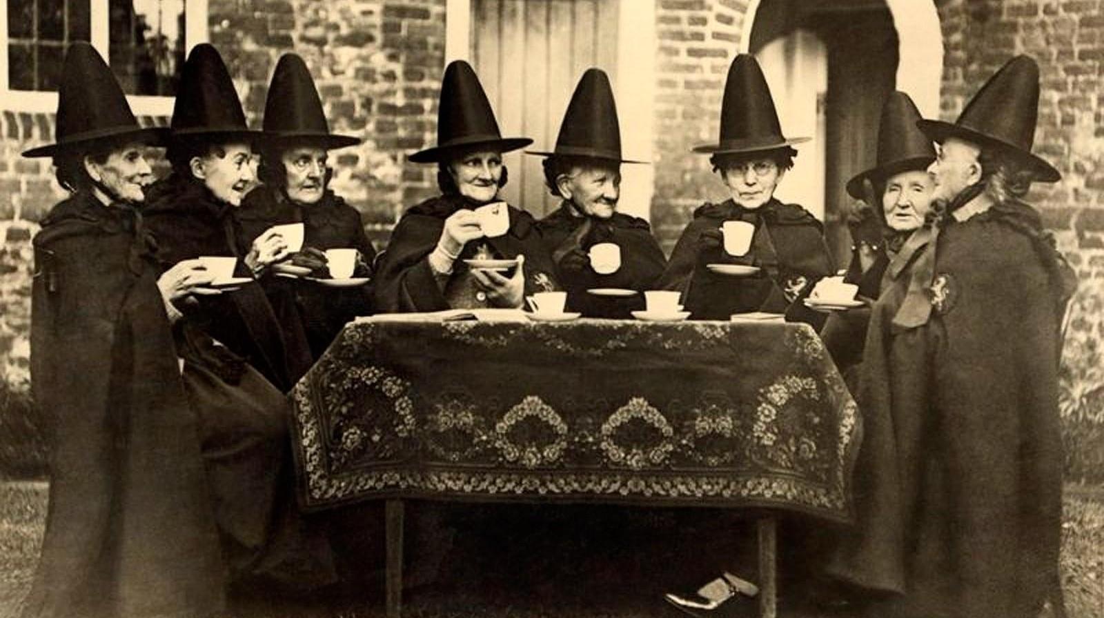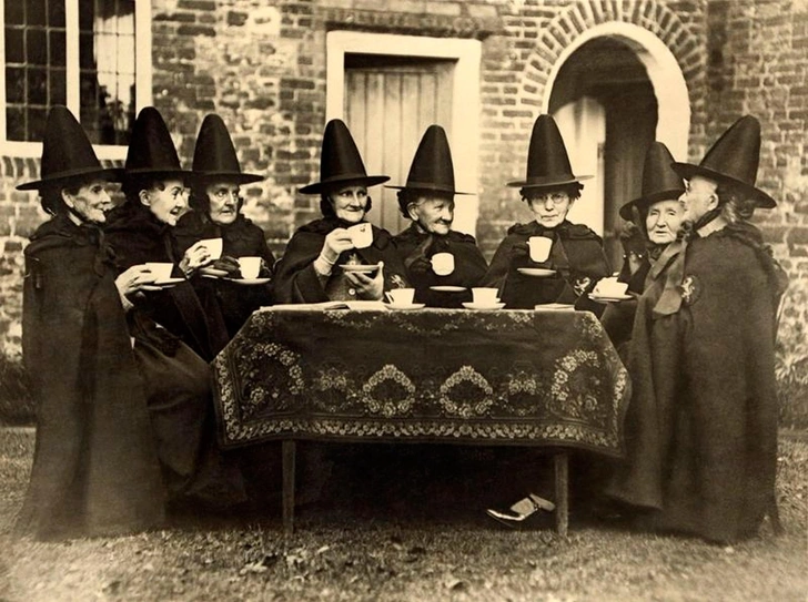 Снимку более ста лет, датируется он примерно 1920 годом и сделан в английском графстве Норфолк. Пожилые леди в остроконечных шляпах, будто украденных из гардероба Хогвартса, предаются чаепитию во дворе.
