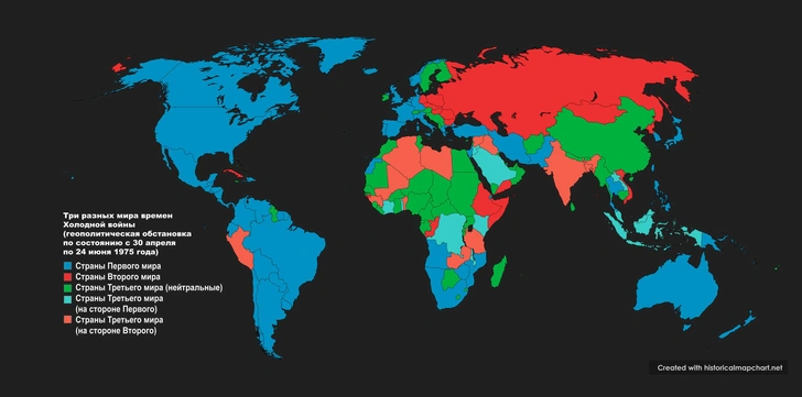 Однако мир именно так и был поделен в понимании экспертов геополитики. Первый мир — США, Европа, Япония и их капиталистические сателлиты. Второй мир — государства Варшавского договора, кубинские товарищи и так далее. А кто и каким боком примыкал к третьему миру, вы уже сами посмотрите на приложенной карте.
