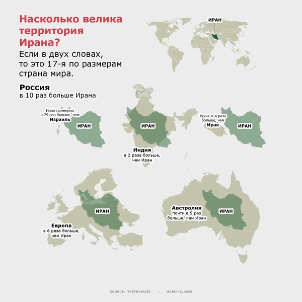 Официальная площадь Ирана (пока новая война его не развалила, чего бы нам крайне не хотелось) — 1 648 195 кв. км. Для сравнения: размеры России в общей сумме составляют 17 125 191 кв. км (хотя прямо сейчас эта цифра, скажем так, нестабильна и варьируется от политических трактовок и ситуации на фронте).