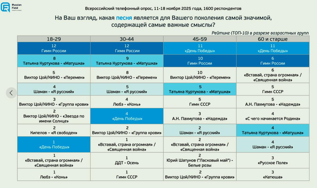 В середине ноября множество россиян разных возрастов, полов и цвета волос приняли звонок от исследовательской службы Russian Field. В трубке прозвучал всего один вопрос, наводящий много дум: «Какая песня для вашего поколения является самой значимой, содержащей самые важные смыслы?»